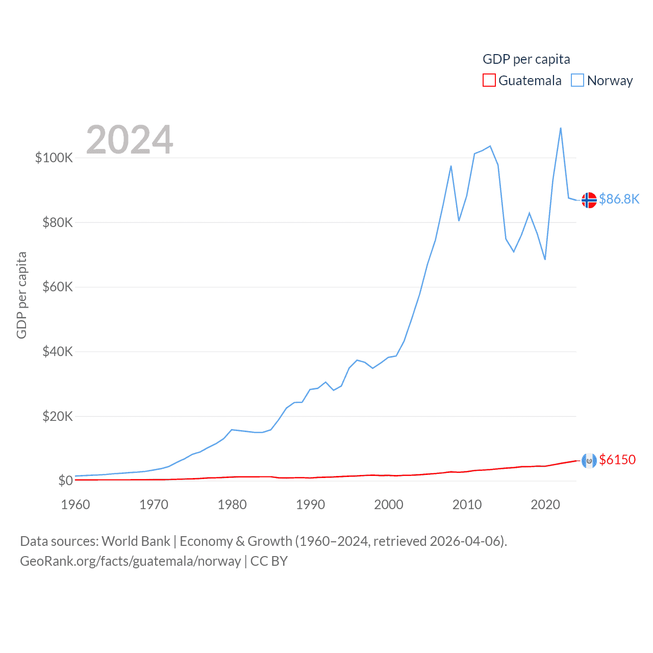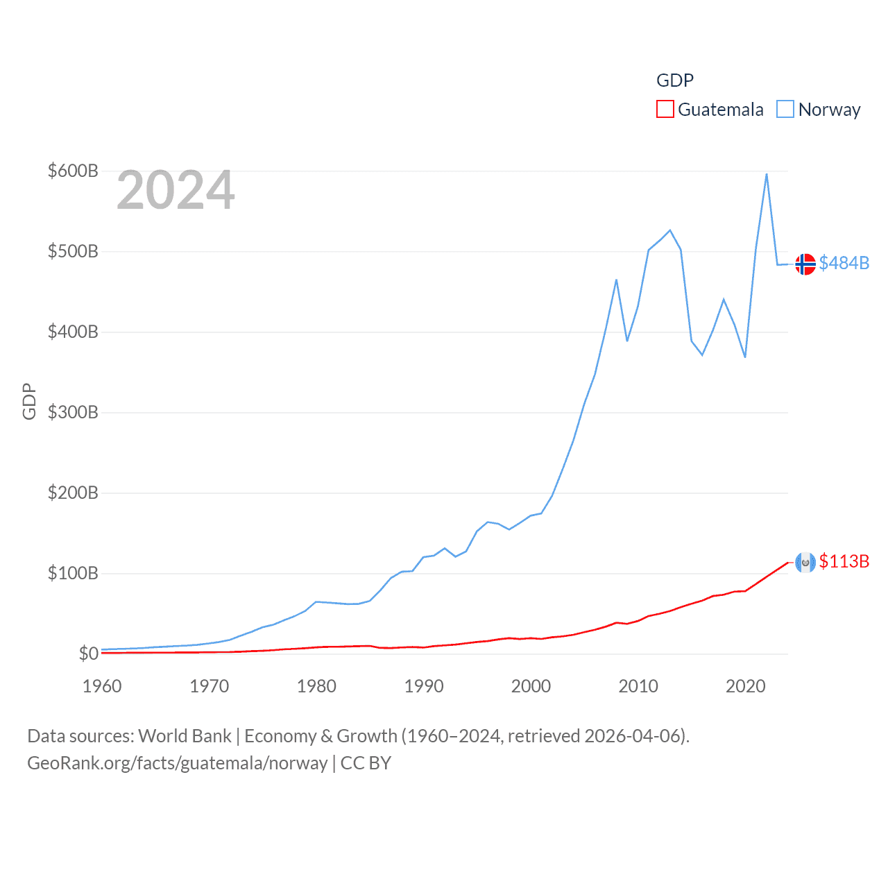 By GDP, Guatemala ranks 68/197 ($113B) and Norway ranks 32/197 ($484B). By GDP per capita, Guatemala ranks 112/197 ($6,150), while Norway ranks 8/197 ($86,785).