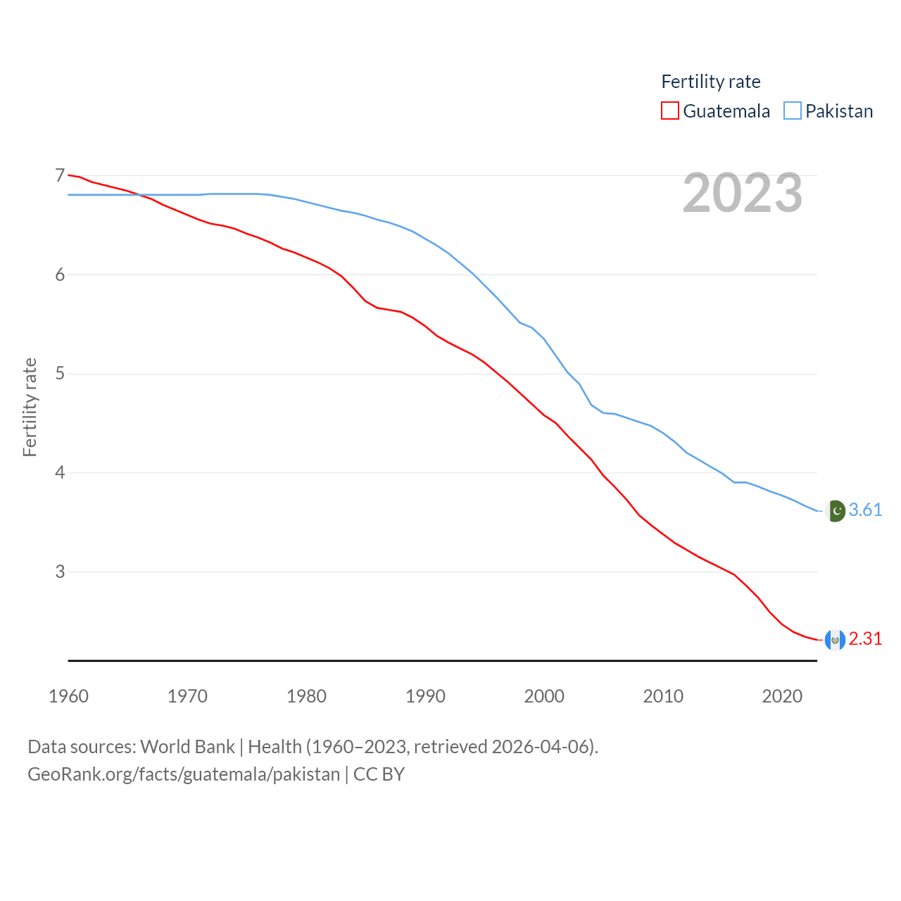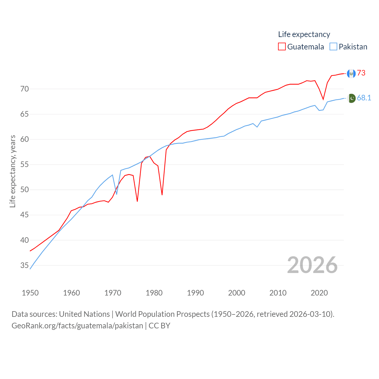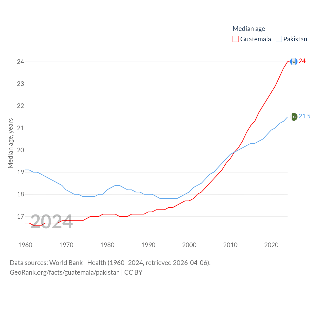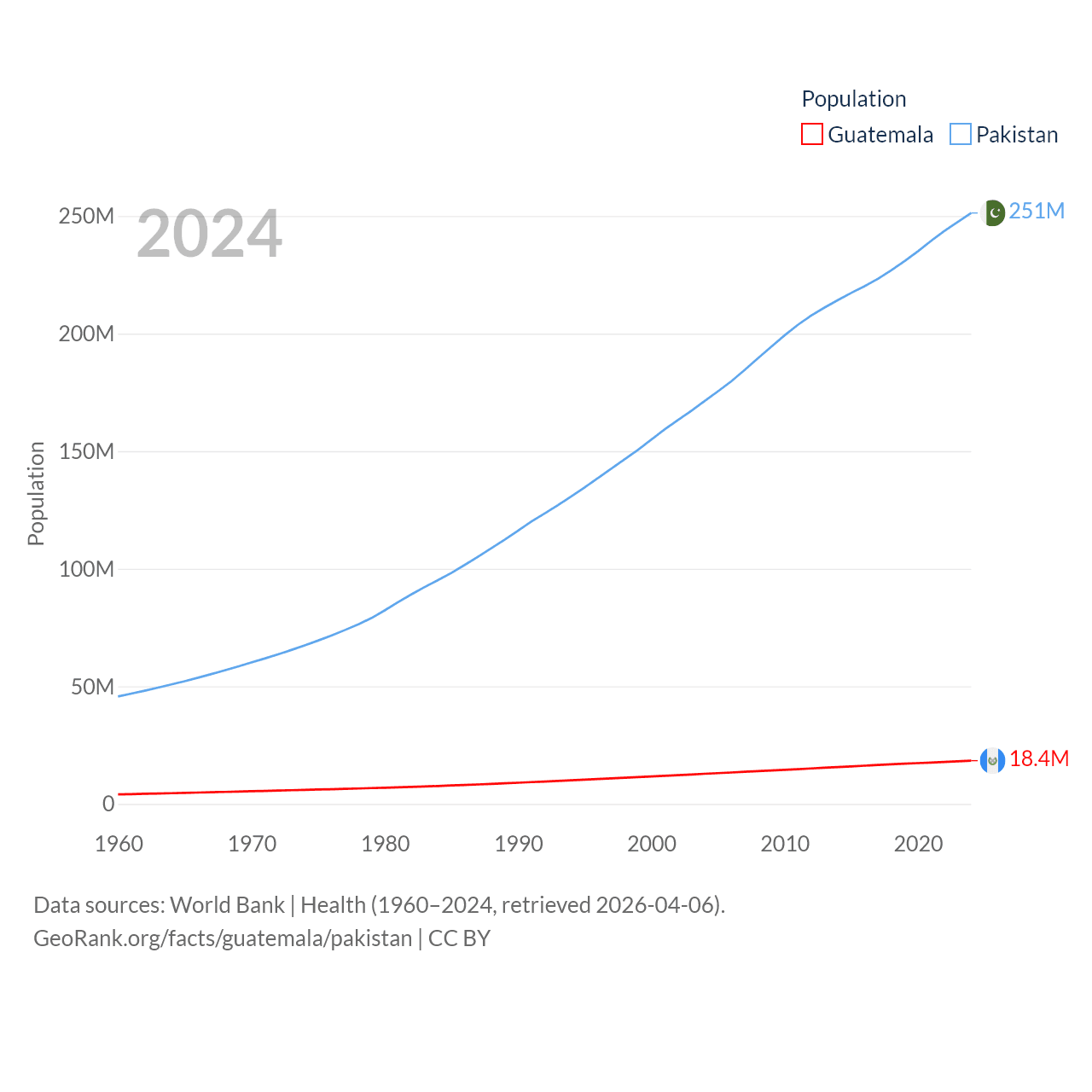 Guatemala has a population of 18.4M (ranked 70/197), compared with 251M in Pakistan (ranked 5/197). Guatemala's land area is 41,375 sq mi versus 297,638 sq mi for Pakistan (ranked 102nd vs. 35th).
