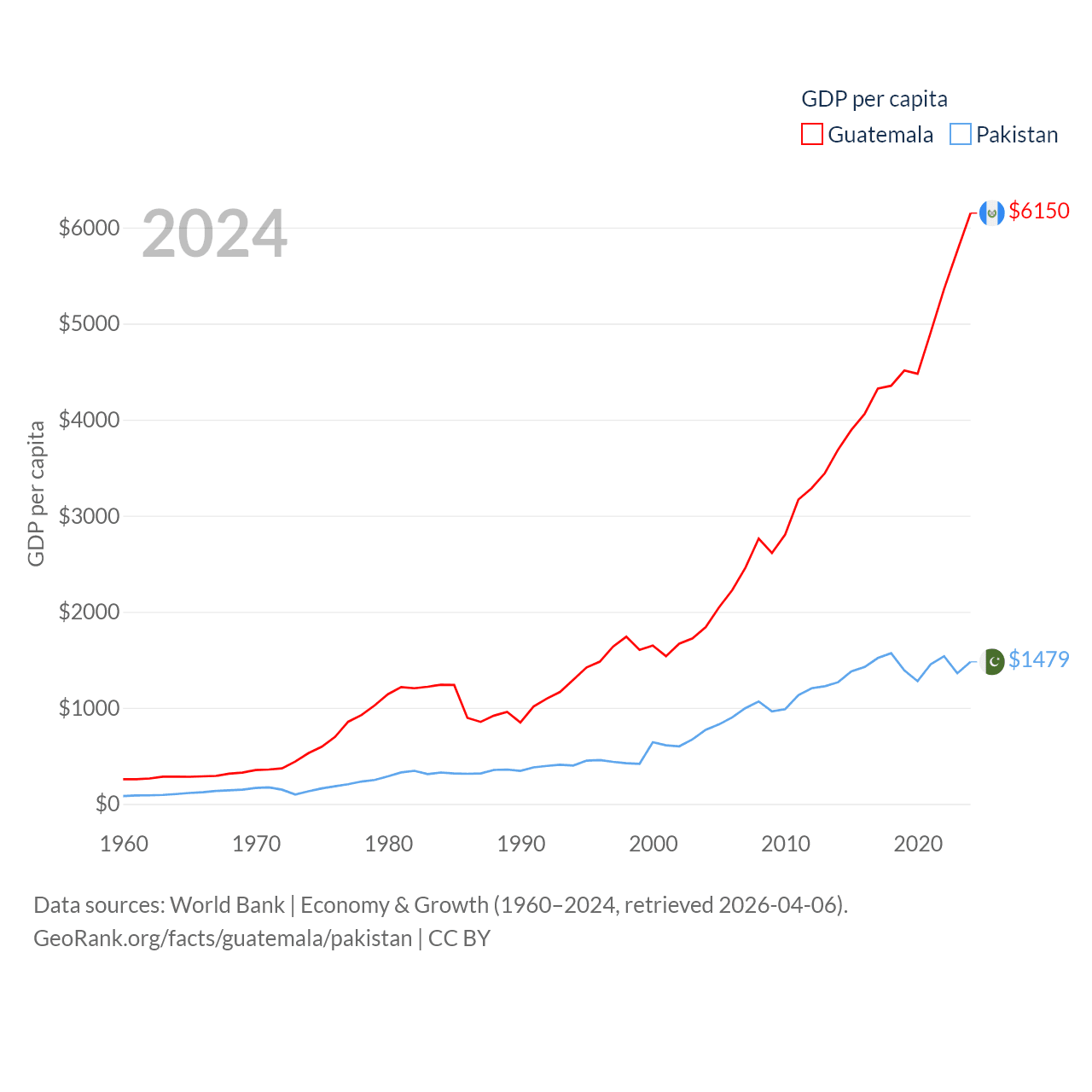 By GDP, Guatemala ranks 68/197 ($113B) and Pakistan ranks 43/197 ($372B). By GDP per capita, Guatemala ranks 112/197 ($6,150), while Pakistan ranks 163/197 ($1,479).