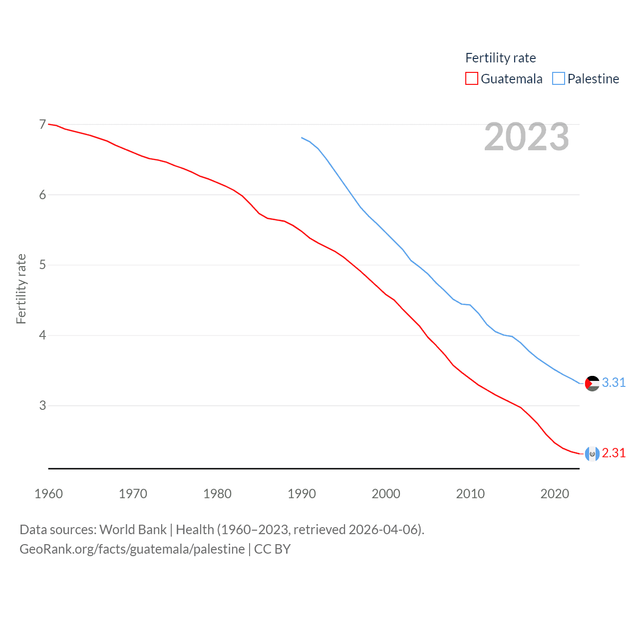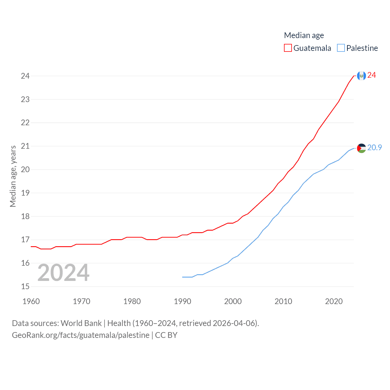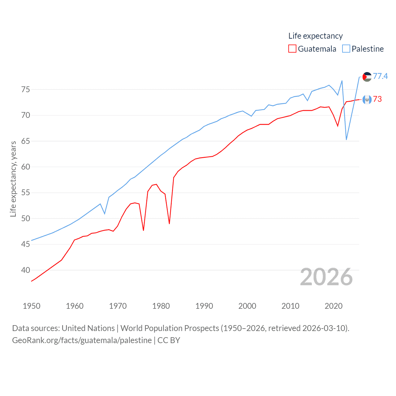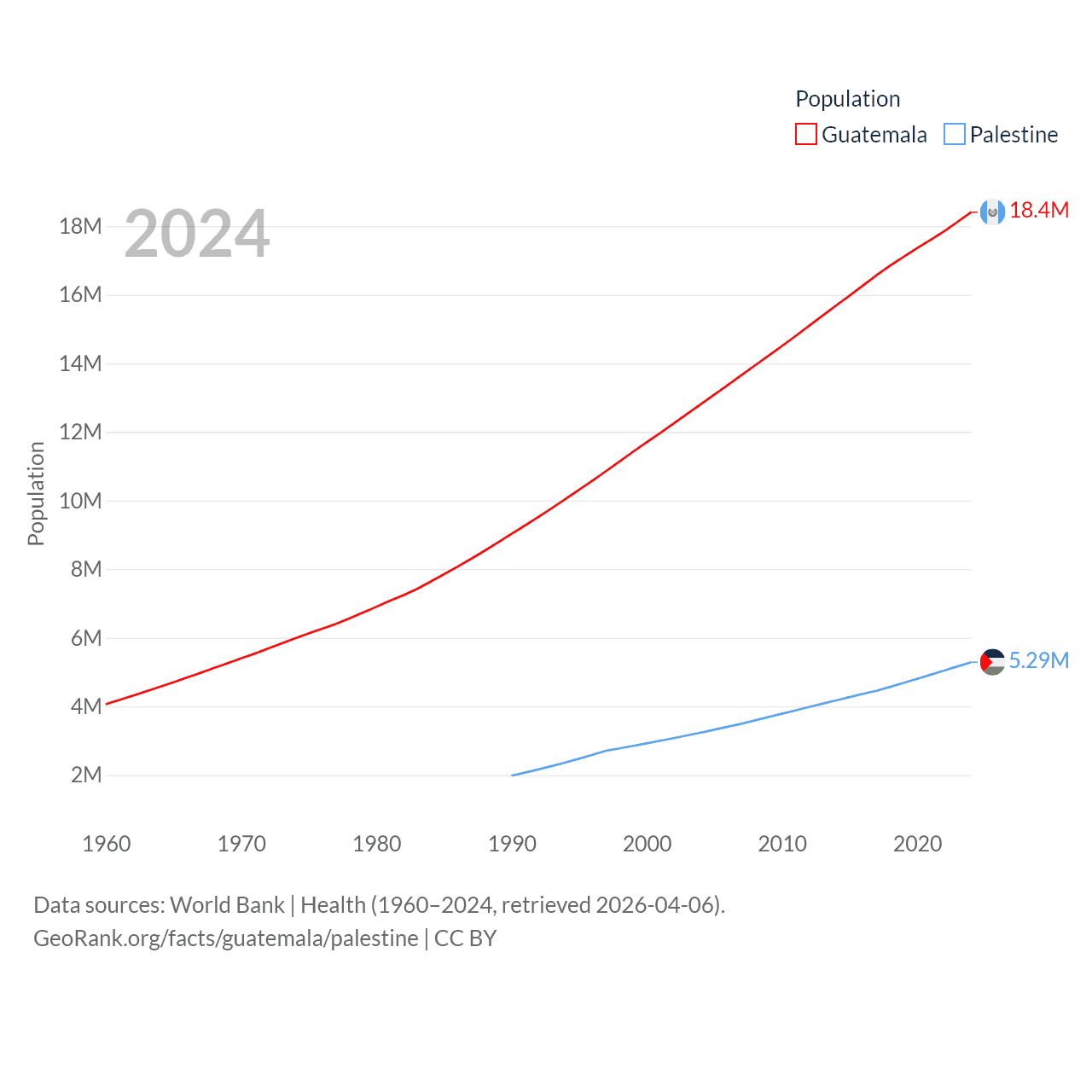 Guatemala has a population of 18.4M (ranked 70/197), compared with 5.29M in Palestine (ranked 122/197). Guatemala's land area is 41,375 sq mi versus 2,326 sq mi for Palestine (ranked 102nd vs. 164th).