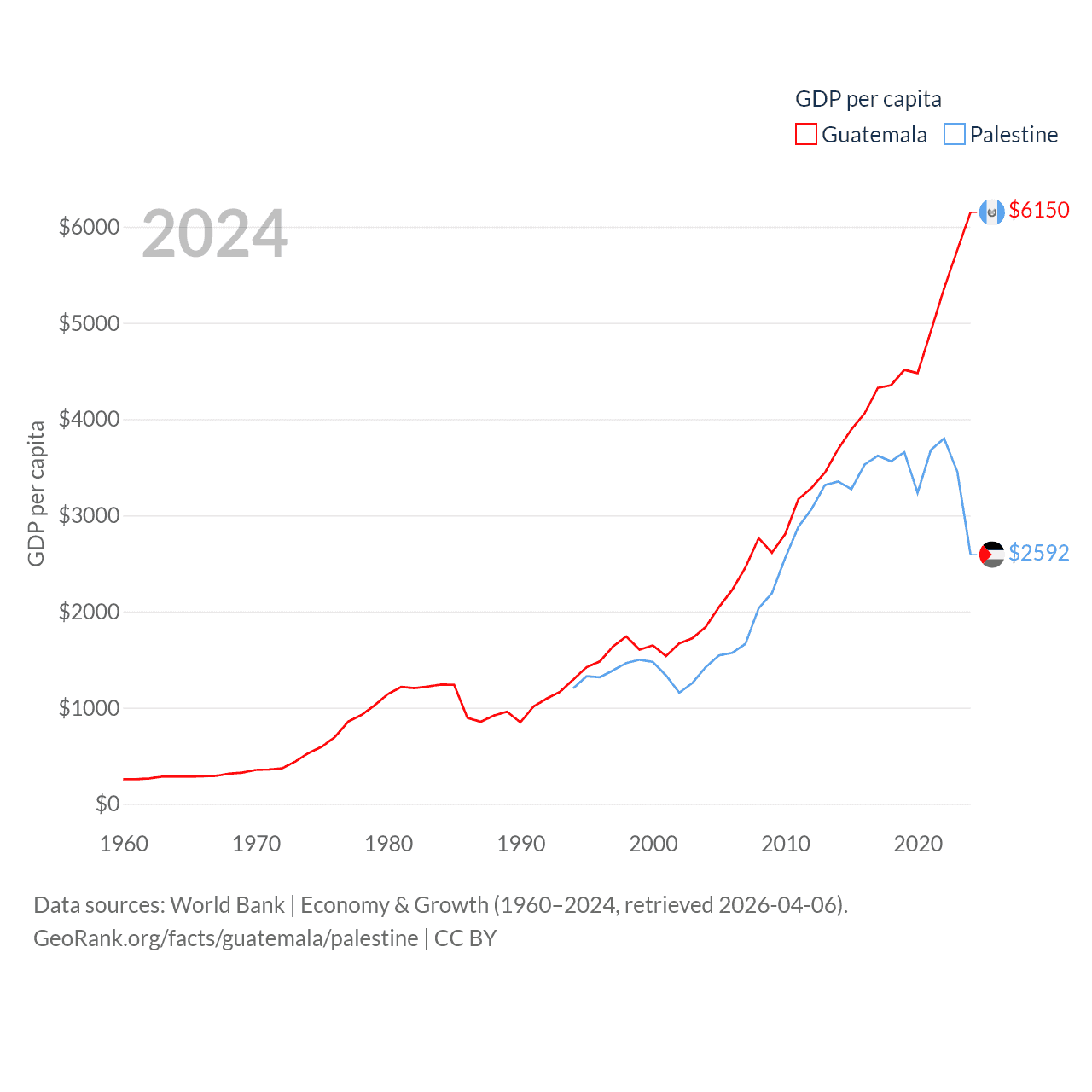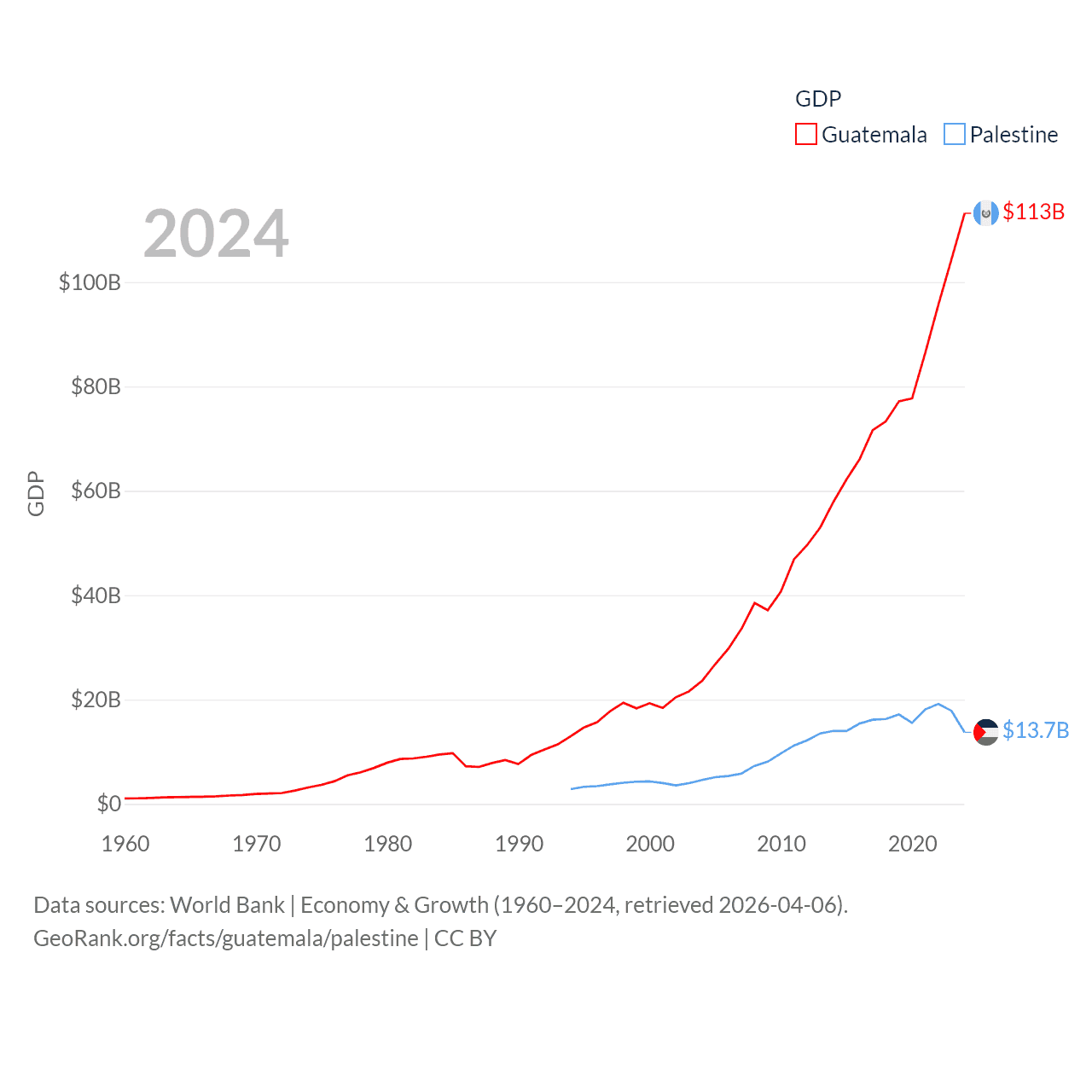 By GDP, Guatemala ranks 68/197 ($113B) and Palestine ranks 146/197 ($13.7B). By GDP per capita, Guatemala ranks 112/197 ($6,150), while Palestine ranks 147/197 ($2,592).