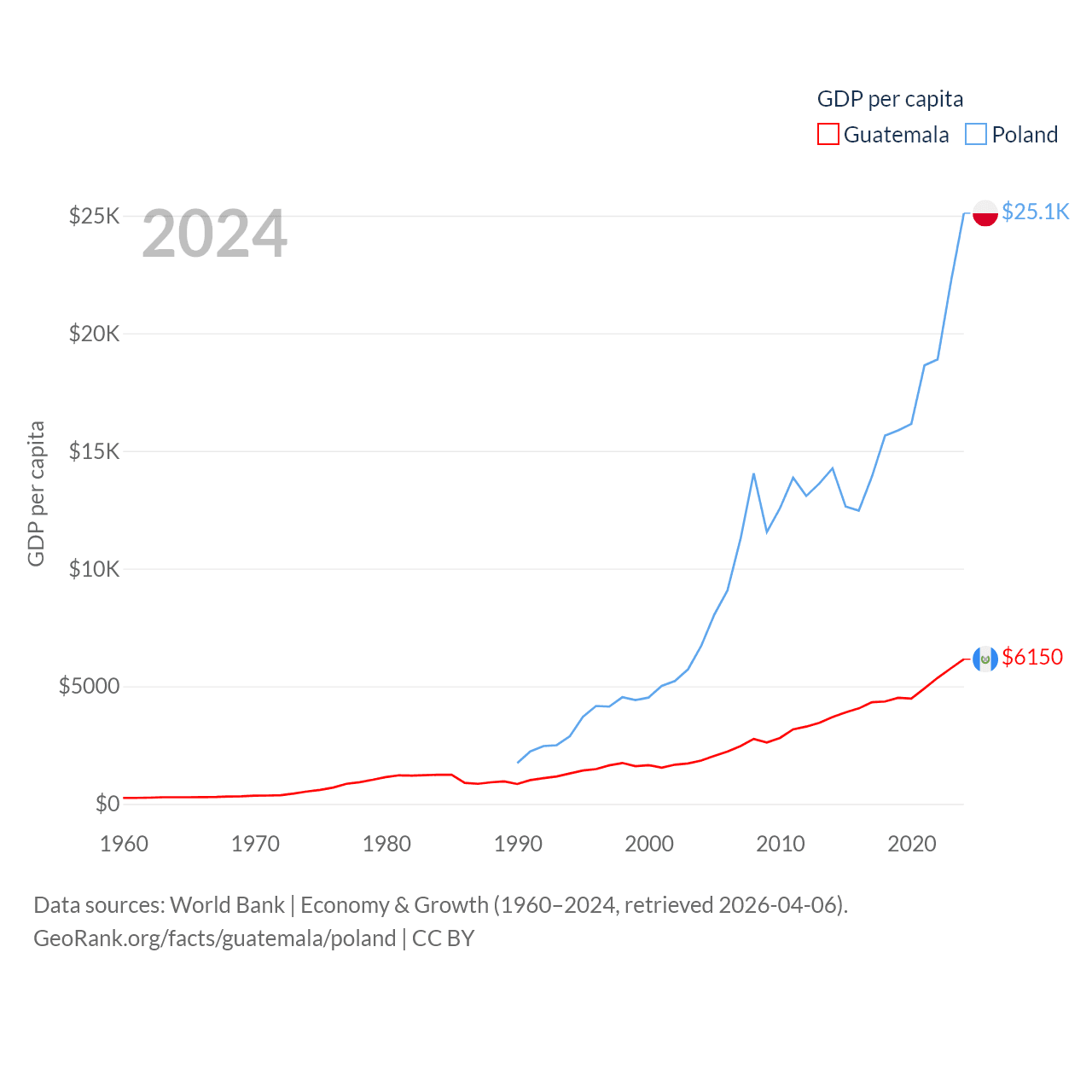 By GDP, Guatemala ranks 68/197 ($113B) and Poland ranks 21/197 ($918B). By GDP per capita, Guatemala ranks 112/197 ($6,150), while Poland ranks 48/197 ($25,104).