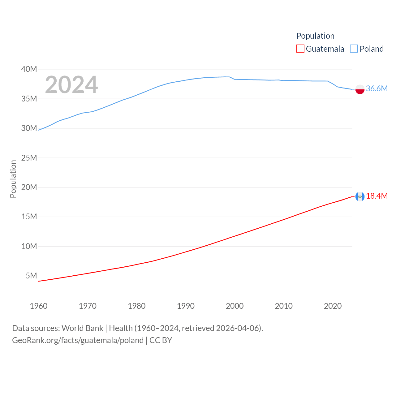 Guatemala has a population of 18.4M (ranked 70/197), compared with 36.6M in Poland (ranked 42/197). Guatemala's land area is 41,375 sq mi versus 118,252 sq mi for Poland (ranked 102nd vs. 69th).