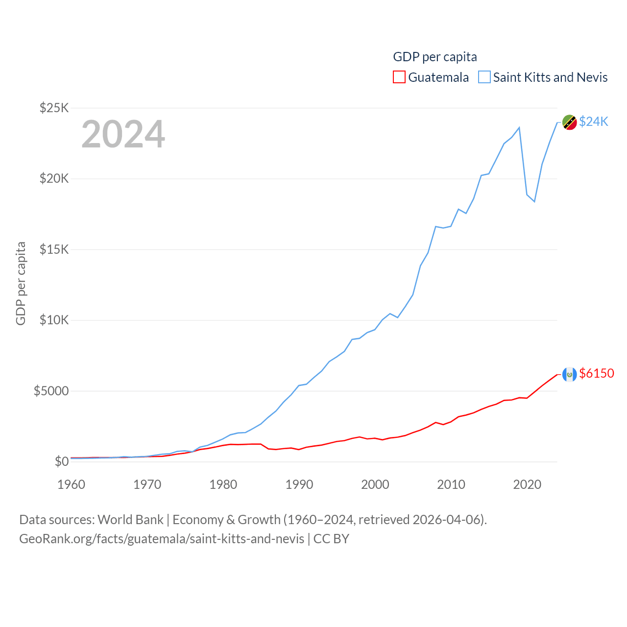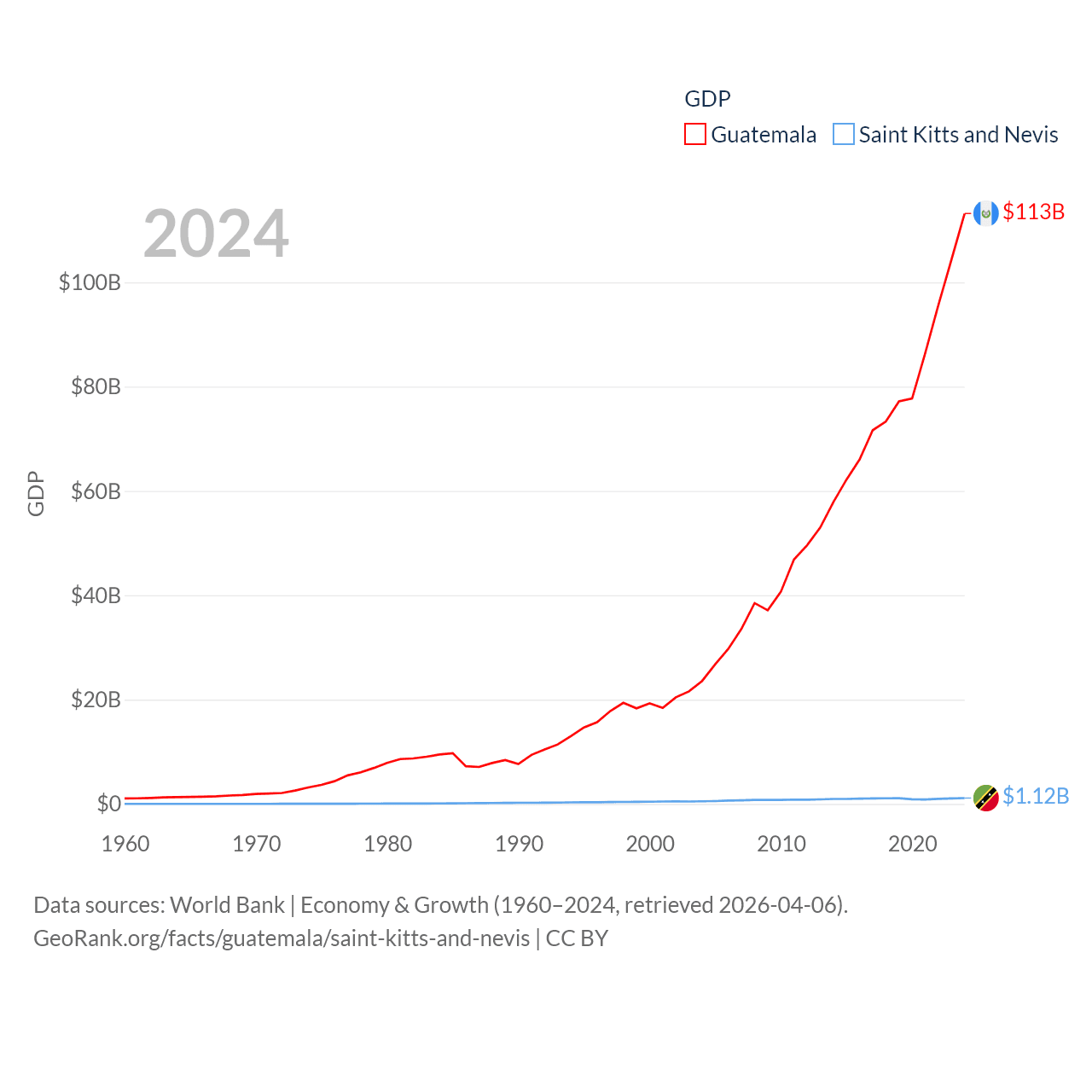 By GDP, Guatemala ranks 68/197 ($113B) and Saint Kitts and Nevis ranks 187/197 ($1.12B). By GDP per capita, Guatemala ranks 112/197 ($6,150), while Saint Kitts and Nevis ranks 51/197 ($23,961).