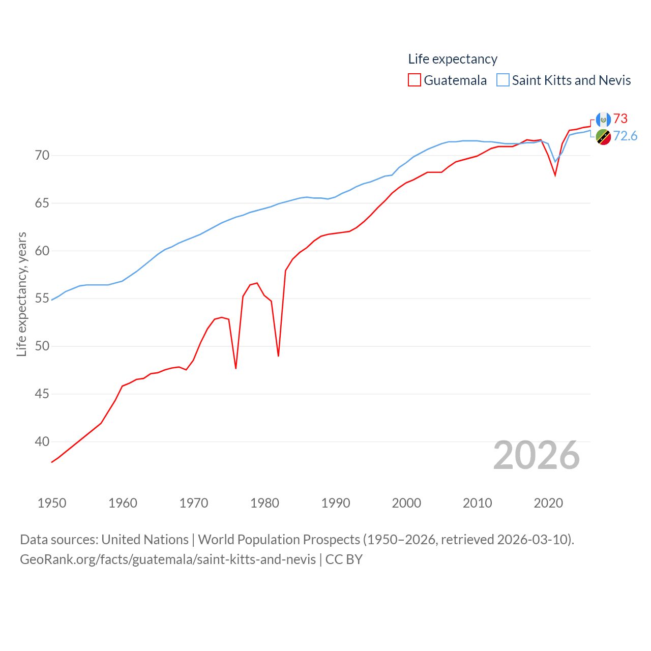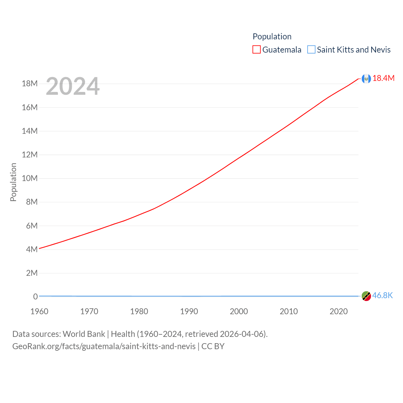 Guatemala has a population of 18.4M (ranked 70/197), compared with 46.8K in Saint Kitts and Nevis (ranked 189/197). Guatemala's land area is 41,375 sq mi versus 100.4 sq mi for Saint Kitts and Nevis (ranked 102nd vs. 189th).