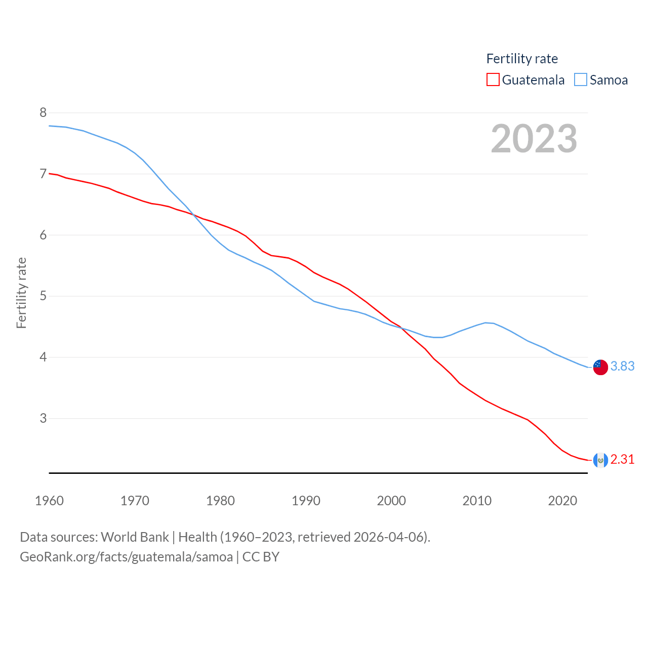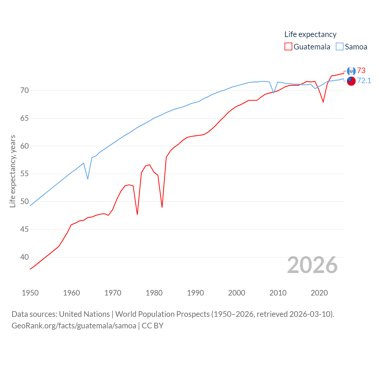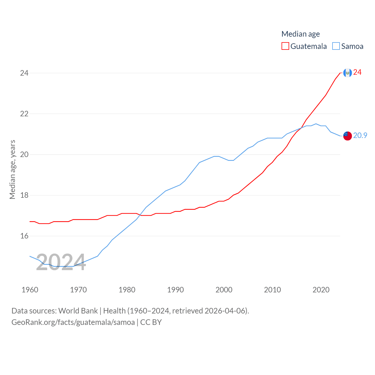 Guatemala has a population of 18.4M (ranked 70/197), compared with 218K in Samoa (ranked 177/197). Guatemala's land area is 41,375 sq mi versus 1,073 sq mi for Samoa (ranked 102nd vs. 168th).