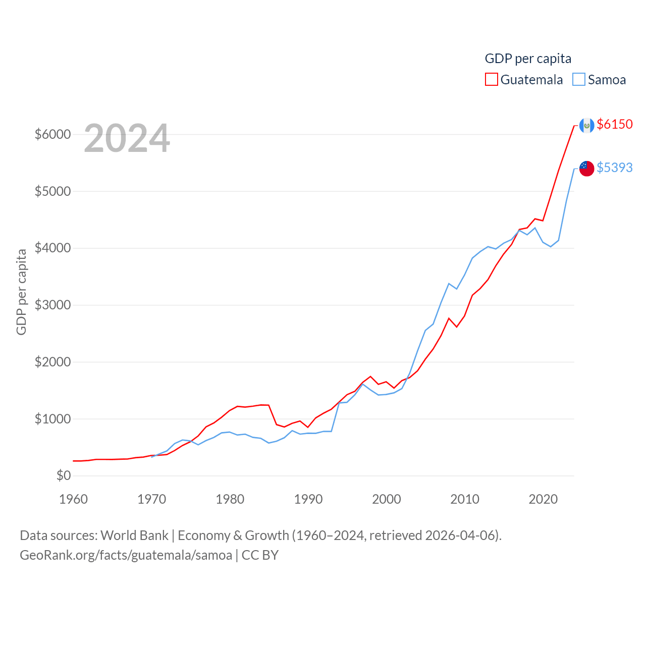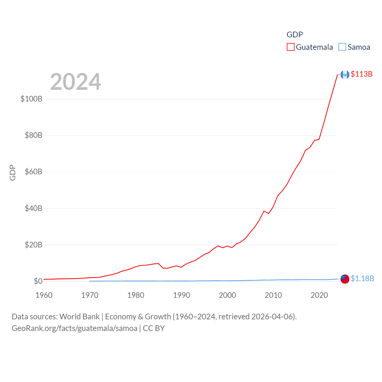By GDP, Guatemala ranks 68/197 ($113B) and Samoa ranks 185/197 ($1.18B). By GDP per capita, Guatemala ranks 112/197 ($6,150), while Samoa ranks 117/197 ($5,393).