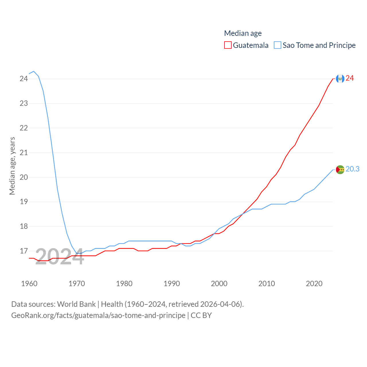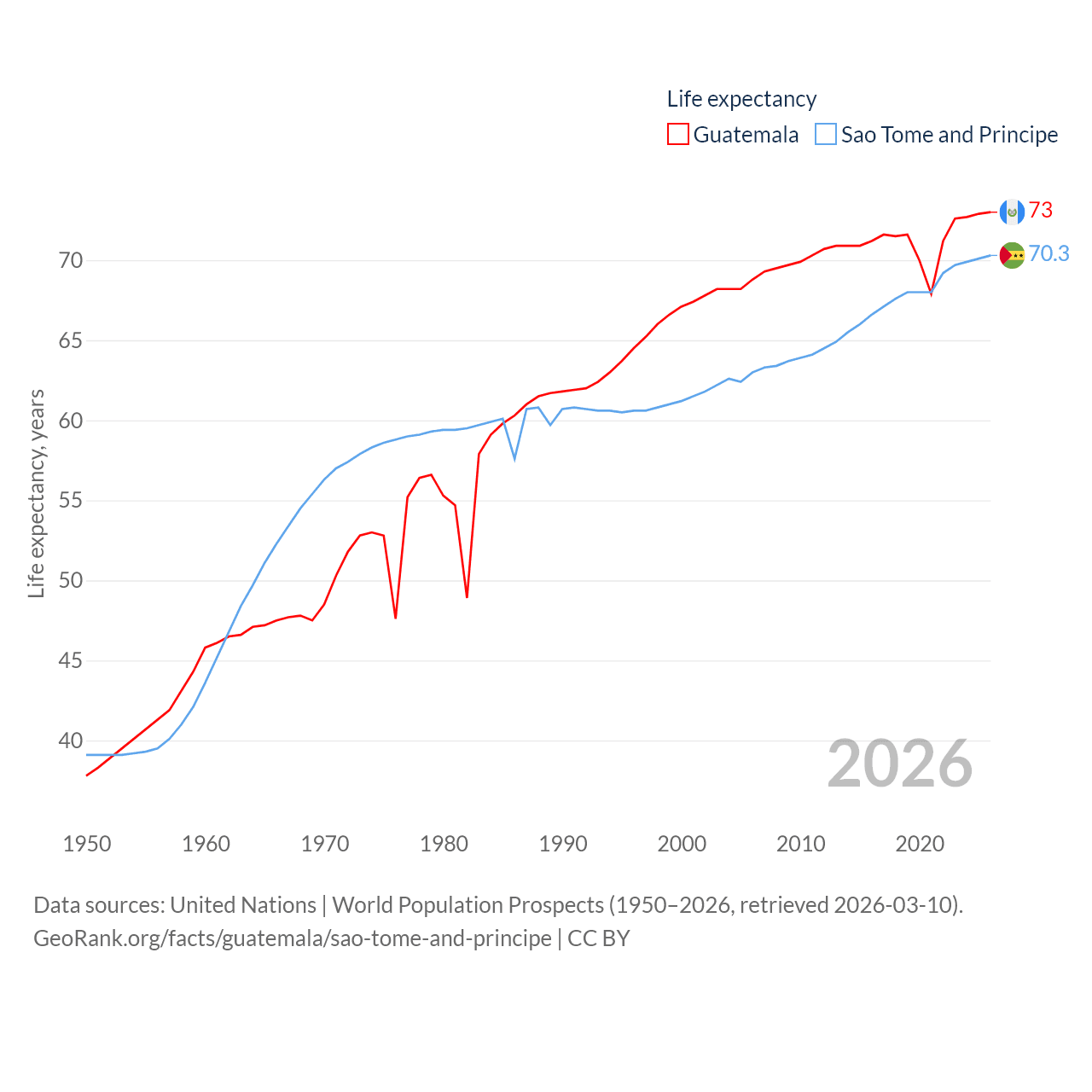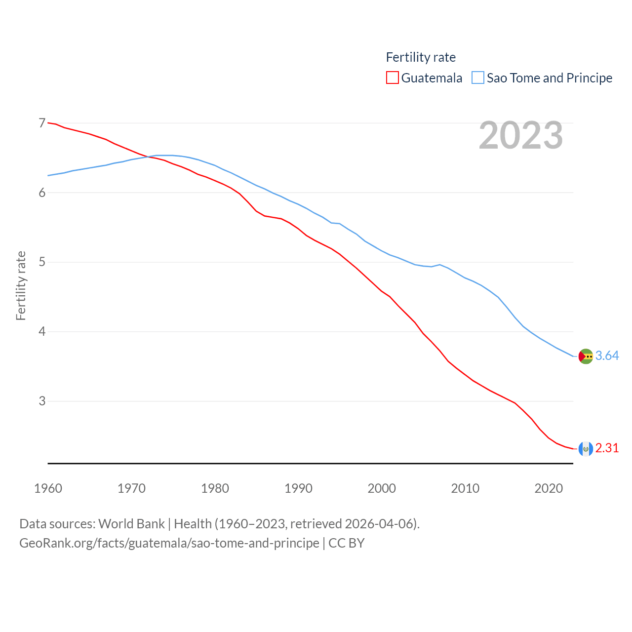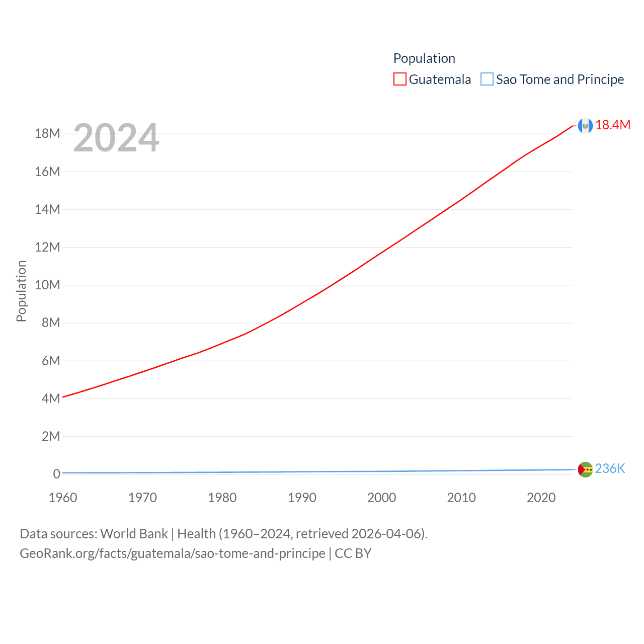 Guatemala has a population of 18.4M (ranked 70/197), compared with 236K in Sao Tome and Principe (ranked 176/197). Guatemala's land area is 41,375 sq mi versus 371 sq mi for Sao Tome and Principe (ranked 102nd vs. 172nd).