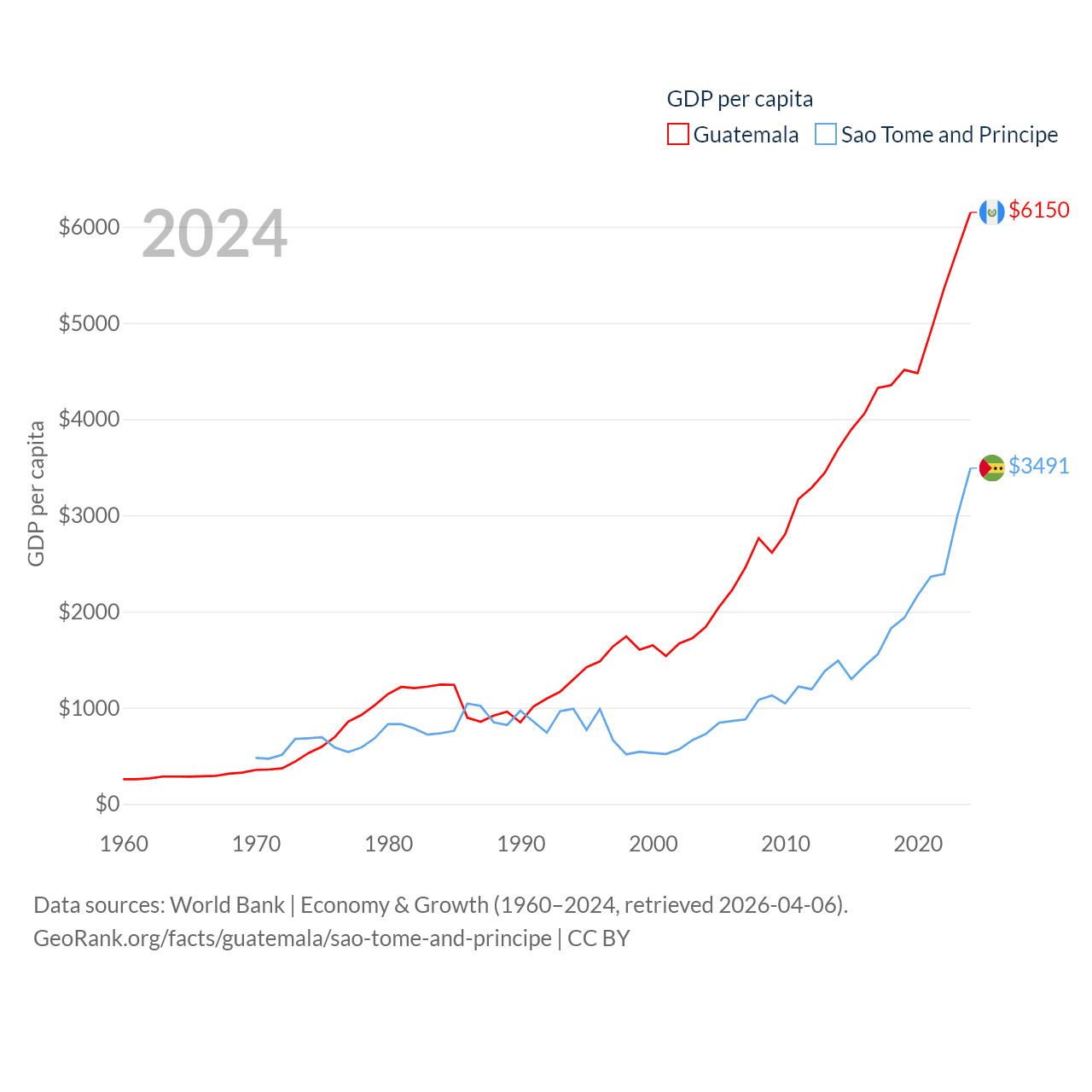 By GDP, Guatemala ranks 68/197 ($113B) and Sao Tome and Principe ranks 189/197 ($822M). By GDP per capita, Guatemala ranks 112/197 ($6,150), while Sao Tome and Principe ranks 134/197 ($3,491).