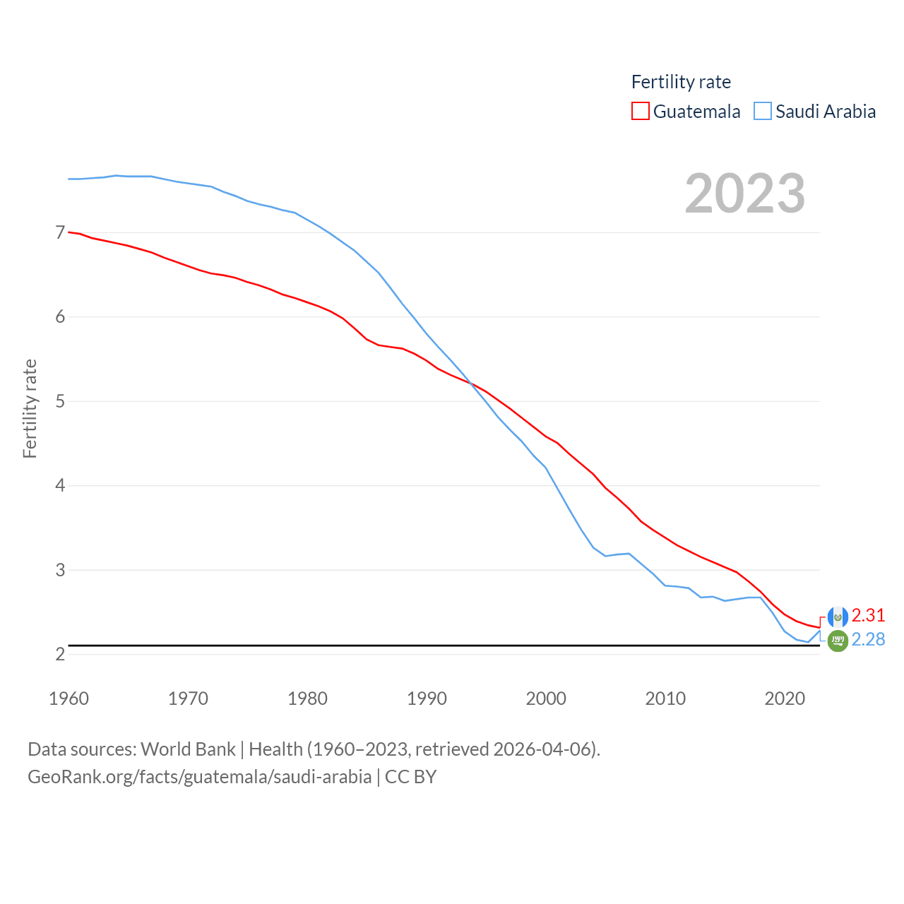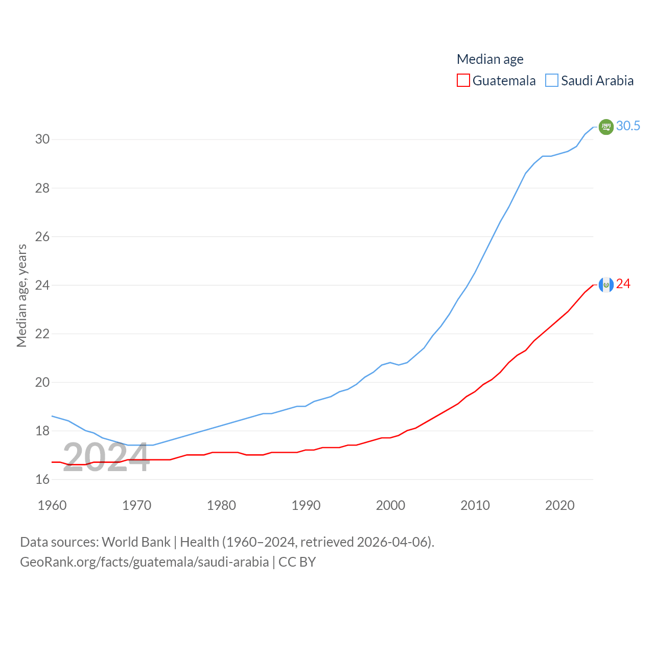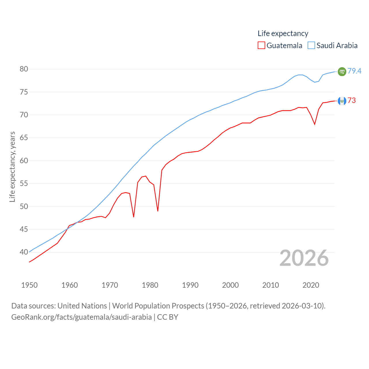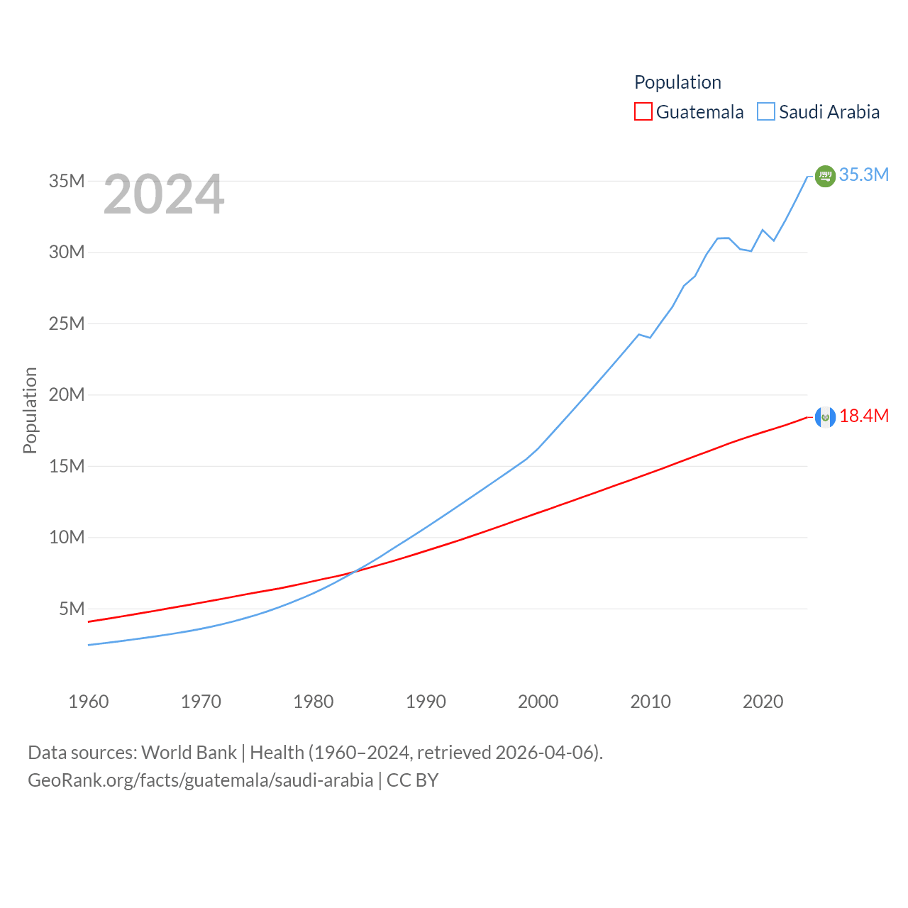 Guatemala has a population of 18.4M (ranked 70/197), compared with 35.3M in Saudi Arabia (ranked 45/197). Guatemala's land area is 41,375 sq mi versus 830,000 sq mi for Saudi Arabia (ranked 102nd vs. 12th).