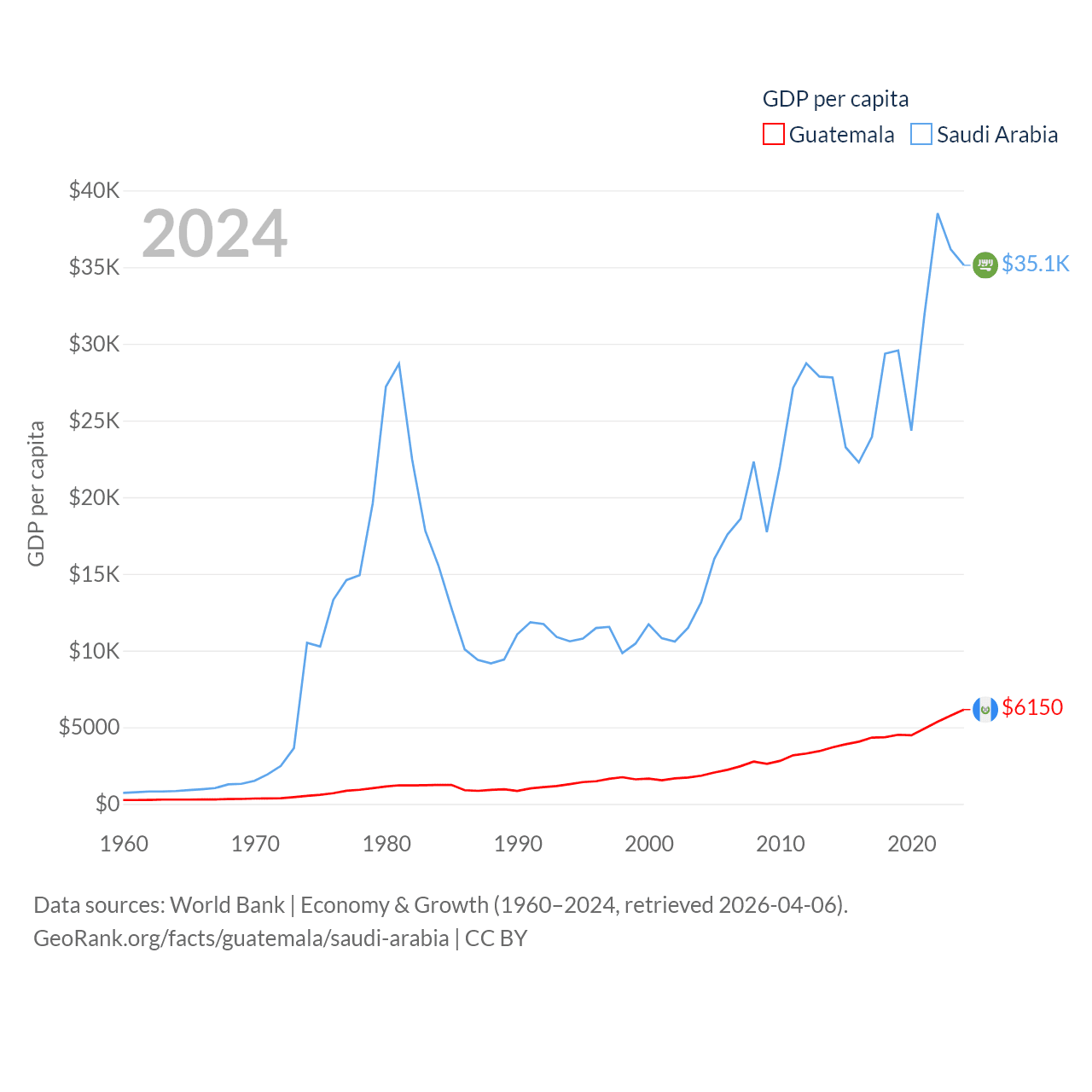 By GDP, Guatemala ranks 68/197 ($113B) and Saudi Arabia ranks 18/197 ($1.24T). By GDP per capita, Guatemala ranks 112/197 ($6,150), while Saudi Arabia ranks 33/197 ($35,122).