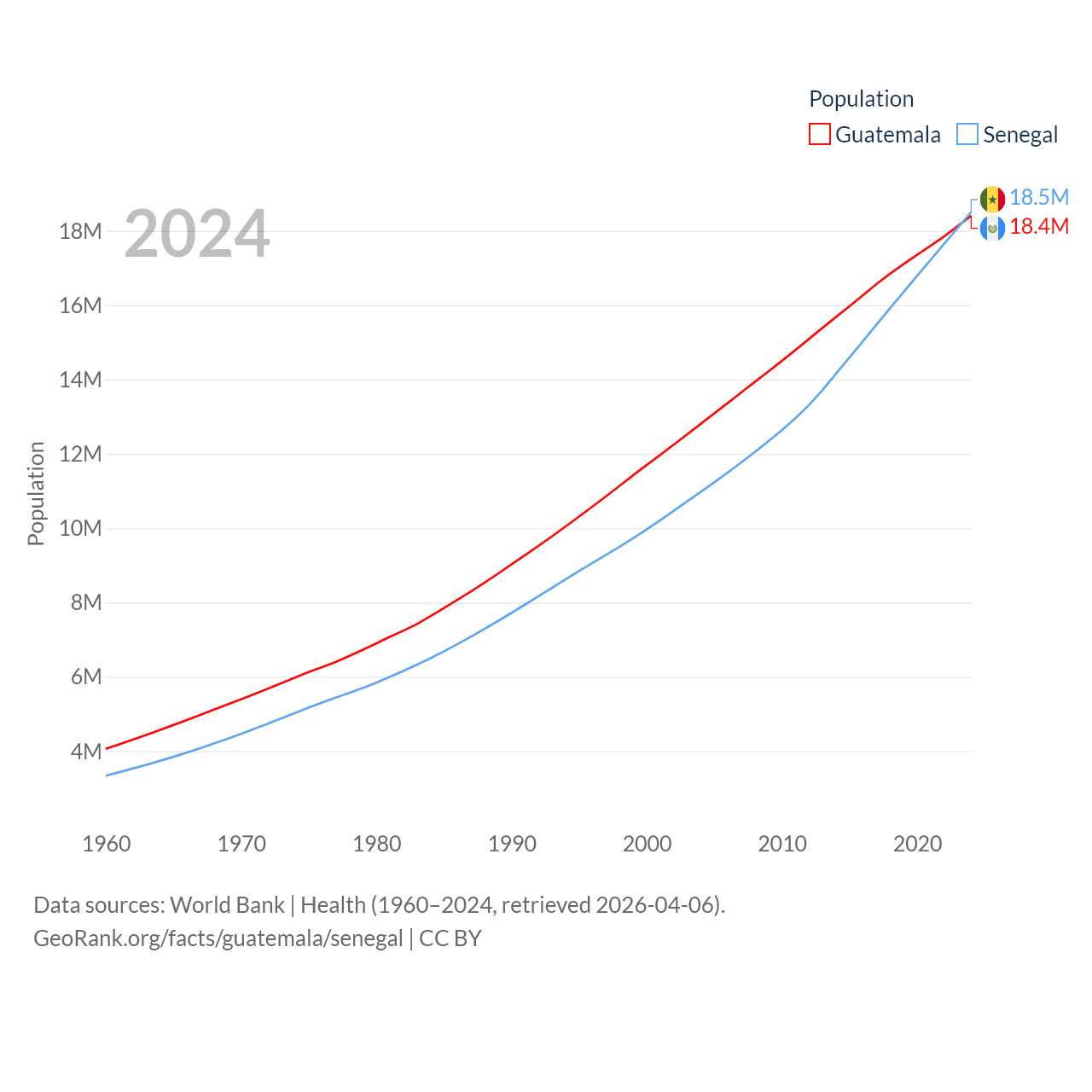 Guatemala has a population of 18.4M (ranked 70/197), compared with 18.5M in Senegal (ranked 69/197). Guatemala's land area is 41,375 sq mi versus 74,336 sq mi for Senegal (ranked 102nd vs. 85th).