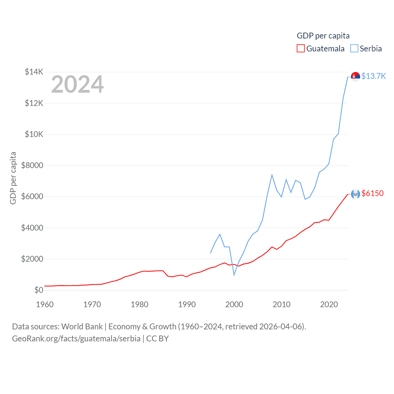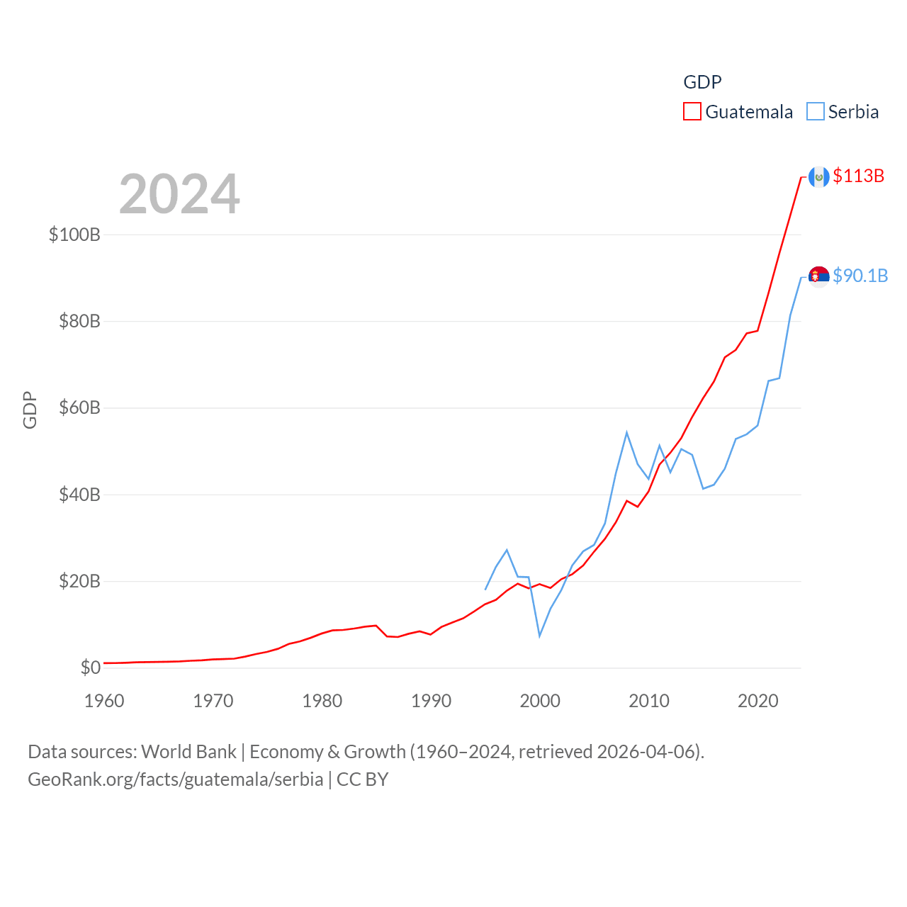 By GDP, Guatemala ranks 68/197 ($113B) and Serbia ranks 76/197 ($90.1B). By GDP per capita, Guatemala ranks 112/197 ($6,150), while Serbia ranks 73/197 ($13,679).