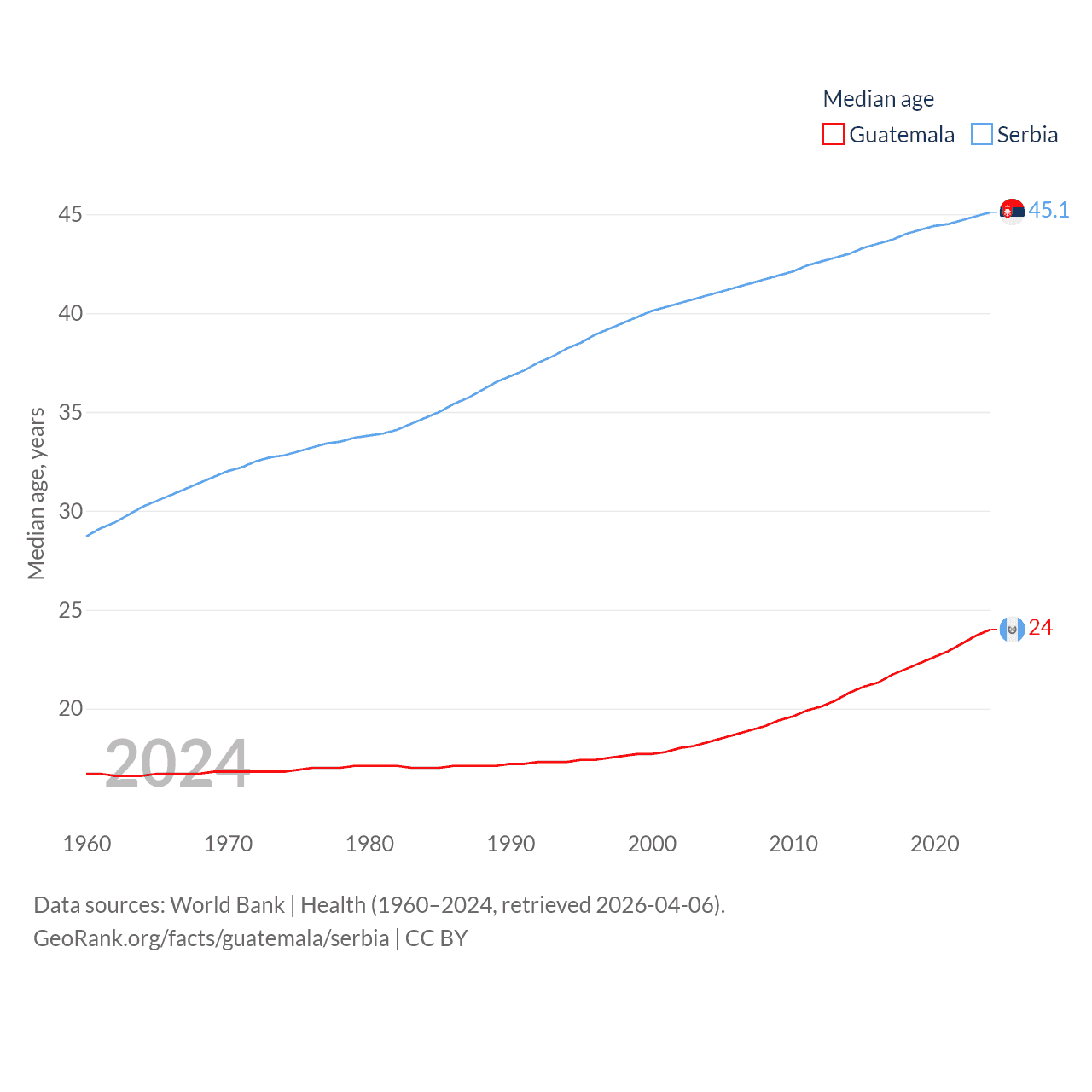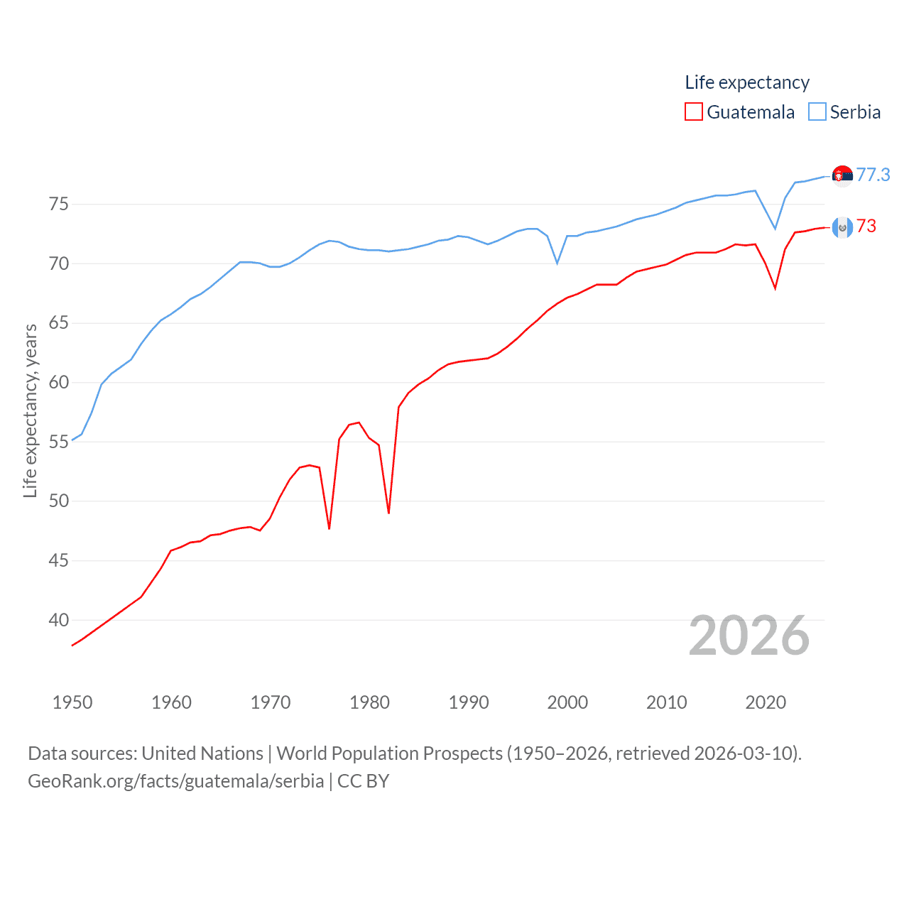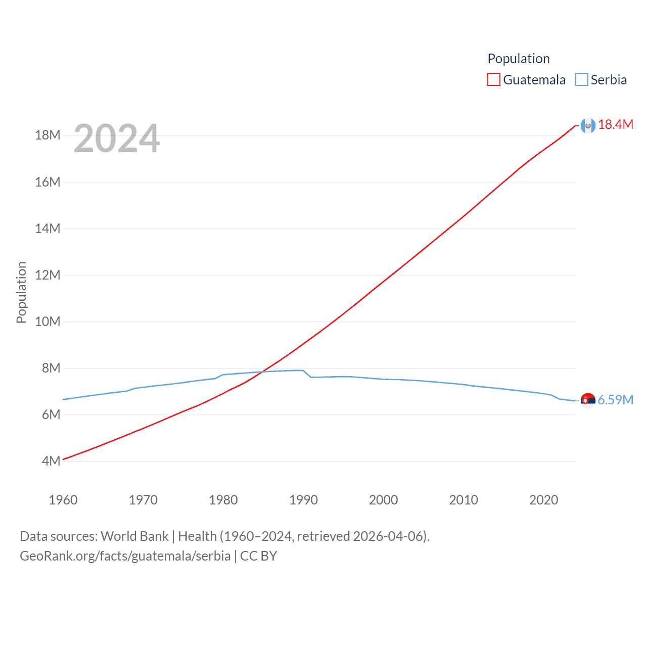 Guatemala has a population of 18.4M (ranked 70/197), compared with 6.59M in Serbia (ranked 109/197). Guatemala's land area is 41,375 sq mi versus 32,467 sq mi for Serbia (ranked 102nd vs. 111th).