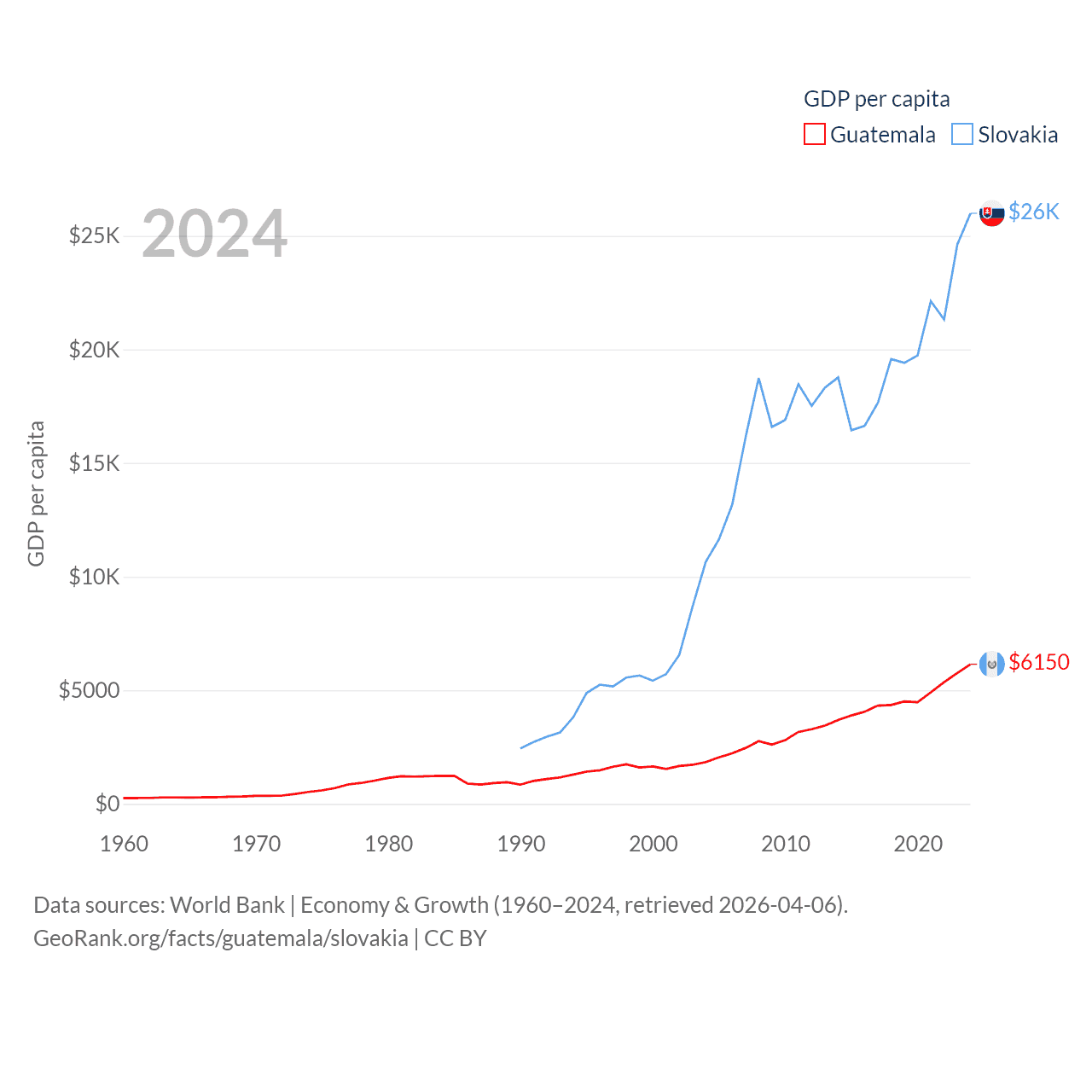 By GDP, Guatemala ranks 68/197 ($113B) and Slovakia ranks 61/197 ($141B). By GDP per capita, Guatemala ranks 112/197 ($6,150), while Slovakia ranks 47/197 ($25,993).