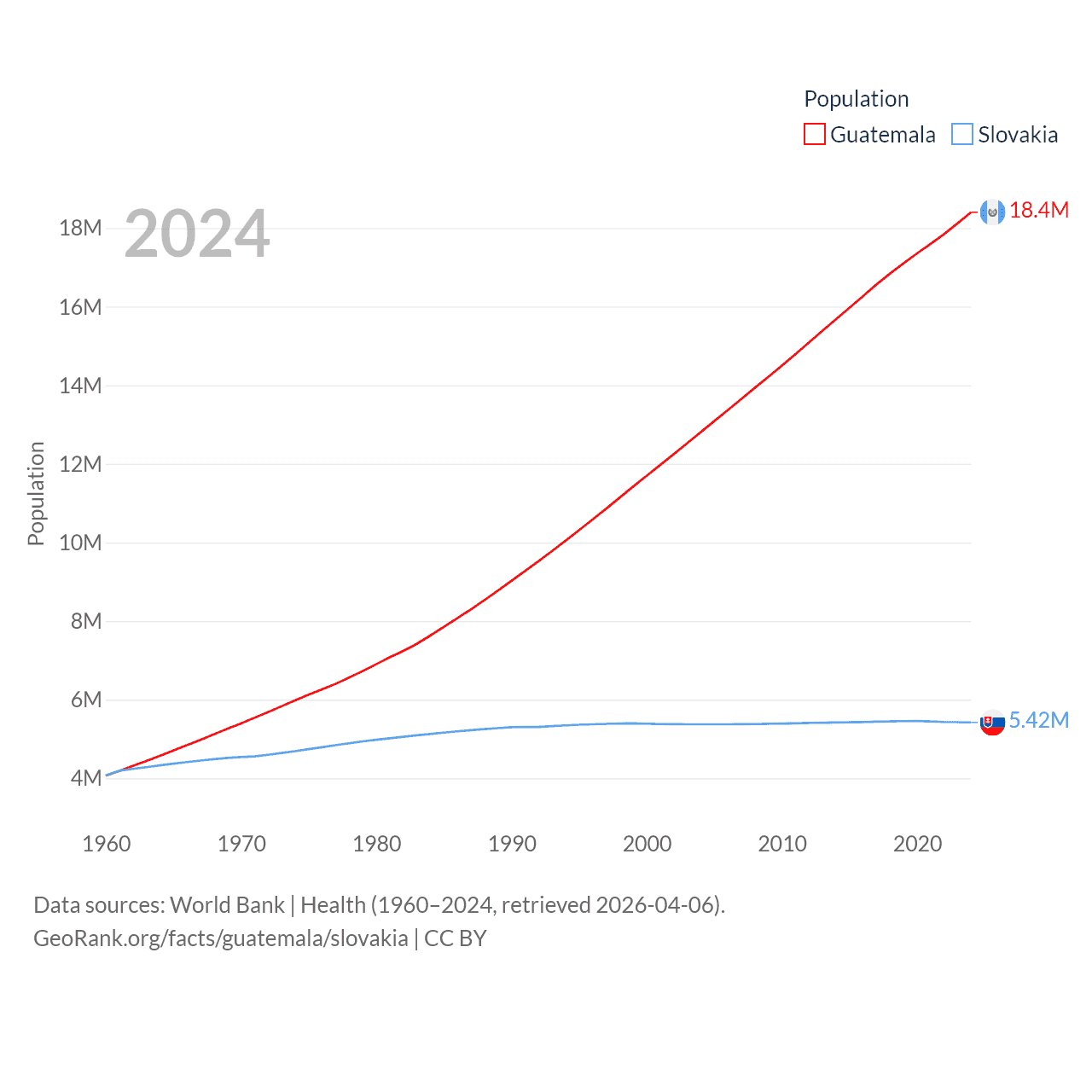 Guatemala has a population of 18.4M (ranked 70/197), compared with 5.42M in Slovakia (ranked 119/197). Guatemala's land area is 41,375 sq mi versus 18,564 sq mi for Slovakia (ranked 102nd vs. 128th).