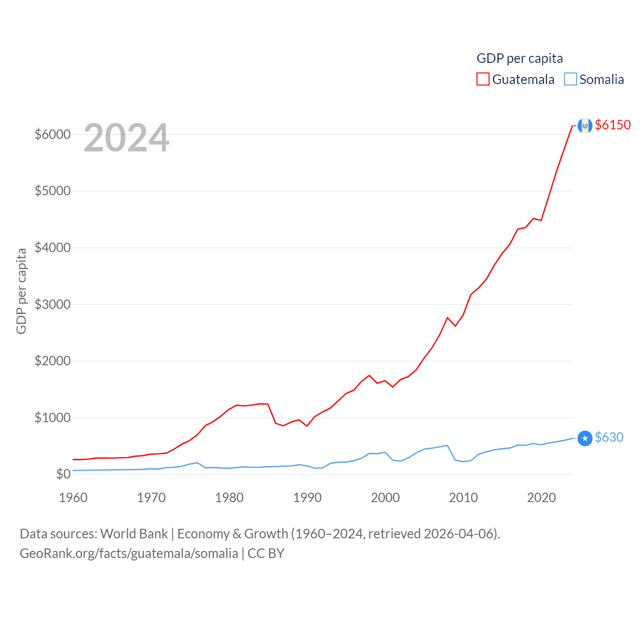By GDP, Guatemala ranks 68/197 ($113B) and Somalia ranks 150/197 ($12B). By GDP per capita, Guatemala ranks 112/197 ($6,150), while Somalia ranks 192/197 ($630).