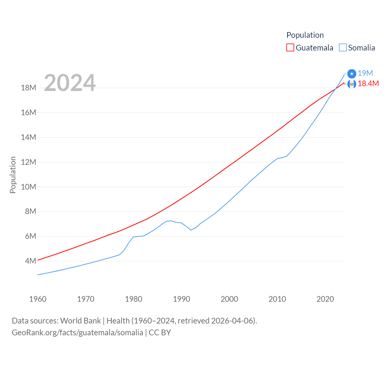 Guatemala has a population of 18.4M (ranked 70/197), compared with 19M in Somalia (ranked 68/197). Guatemala's land area is 41,375 sq mi versus 242,217 sq mi for Somalia (ranked 102nd vs. 42nd).