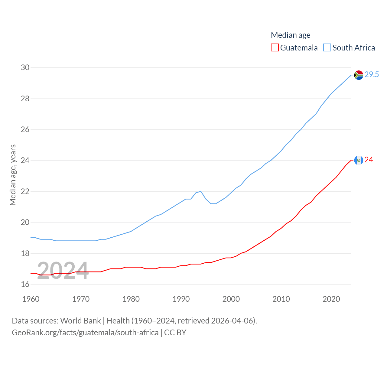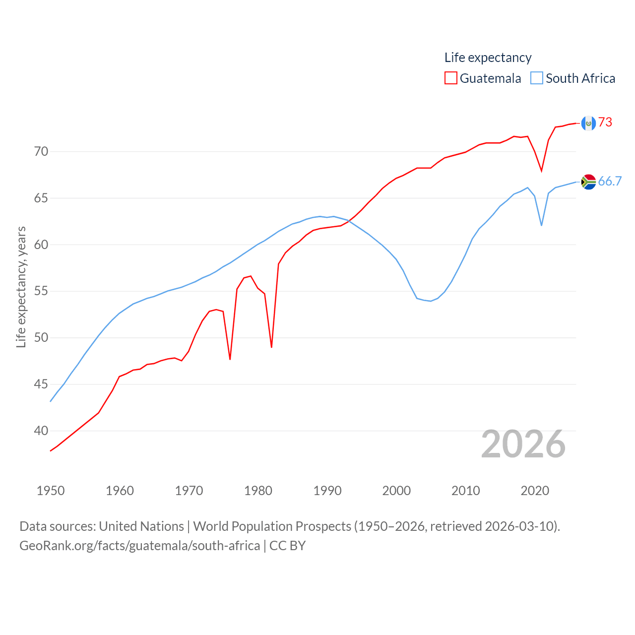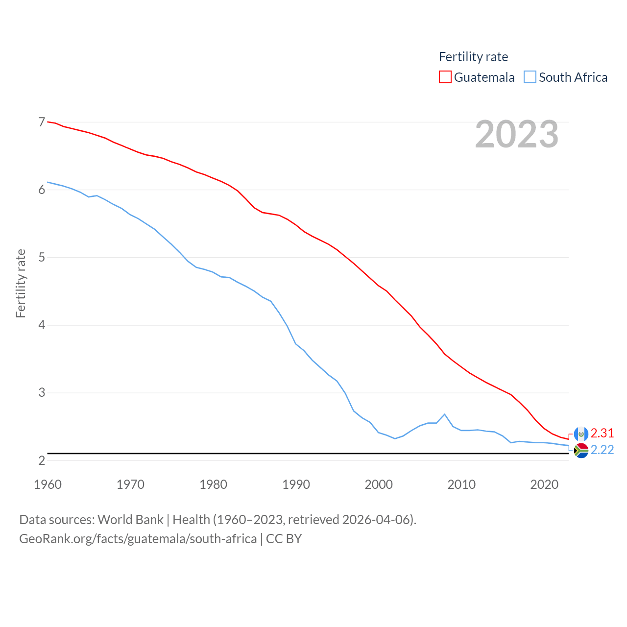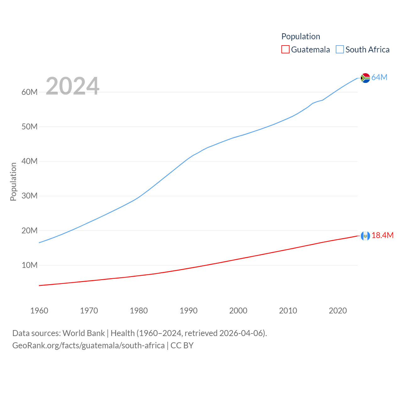 Guatemala has a population of 18.4M (ranked 70/197), compared with 64M in South Africa (ranked 24/197). Guatemala's land area is 41,375 sq mi versus 468,377 sq mi for South Africa (ranked 102nd vs. 24th).