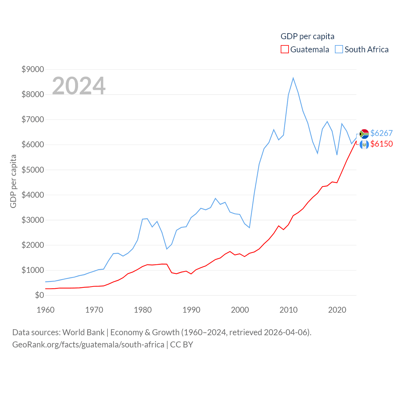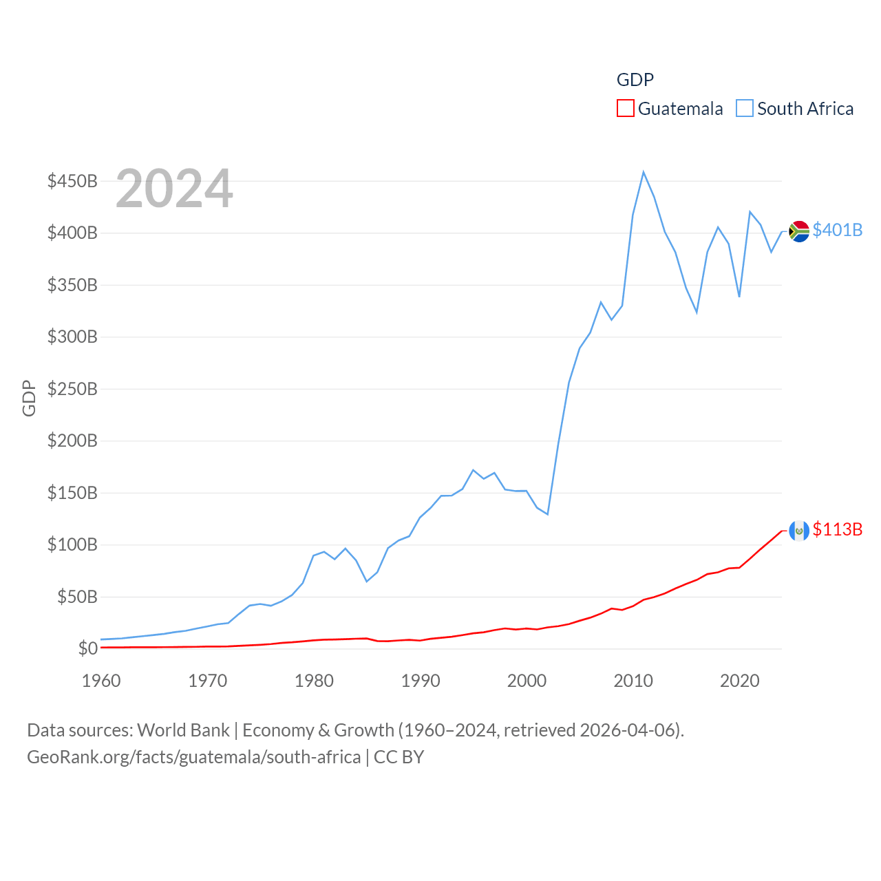 By GDP, Guatemala ranks 68/197 ($113B) and South Africa ranks 40/197 ($401B). By GDP per capita, Guatemala ranks 112/197 ($6,150), while South Africa ranks 111/197 ($6,267).