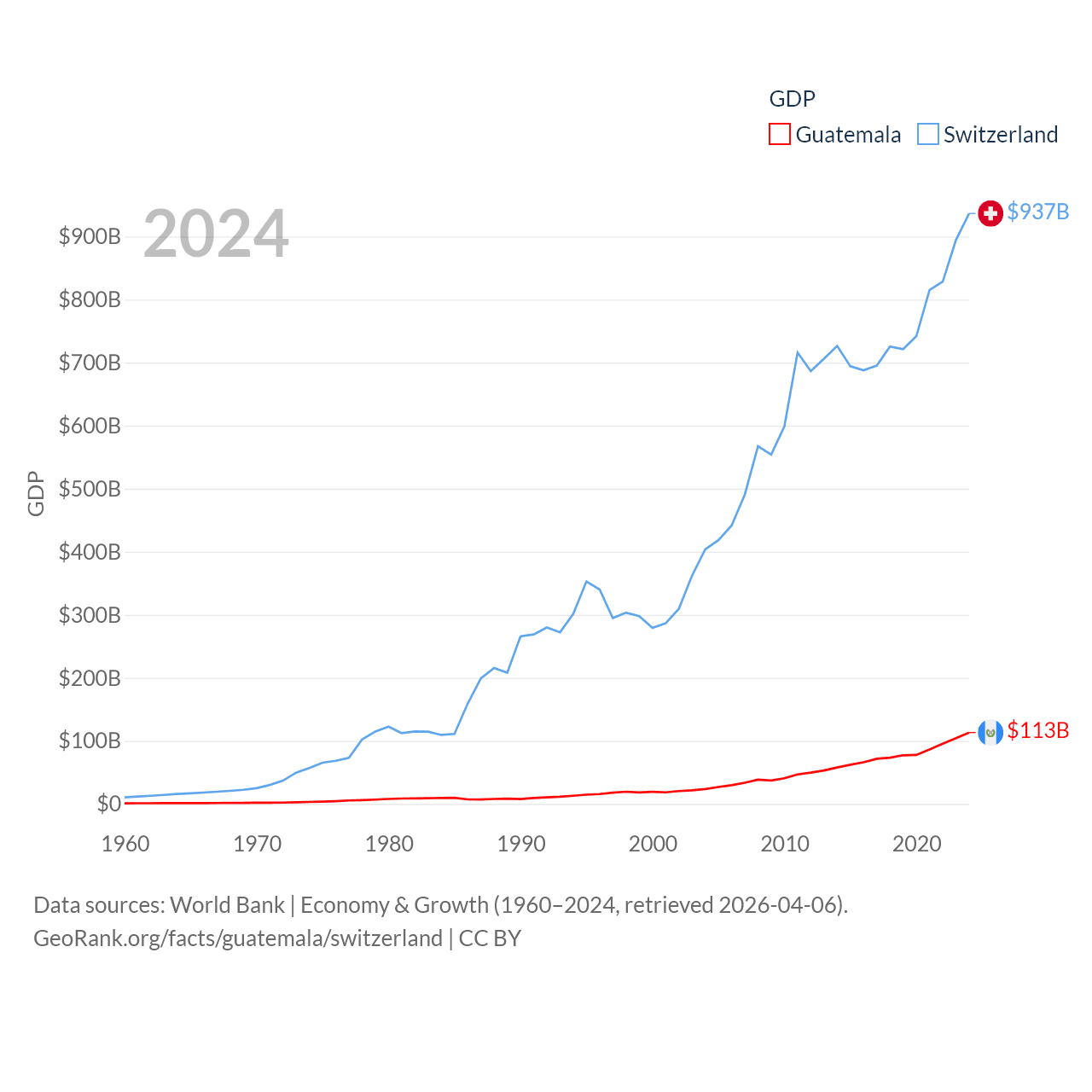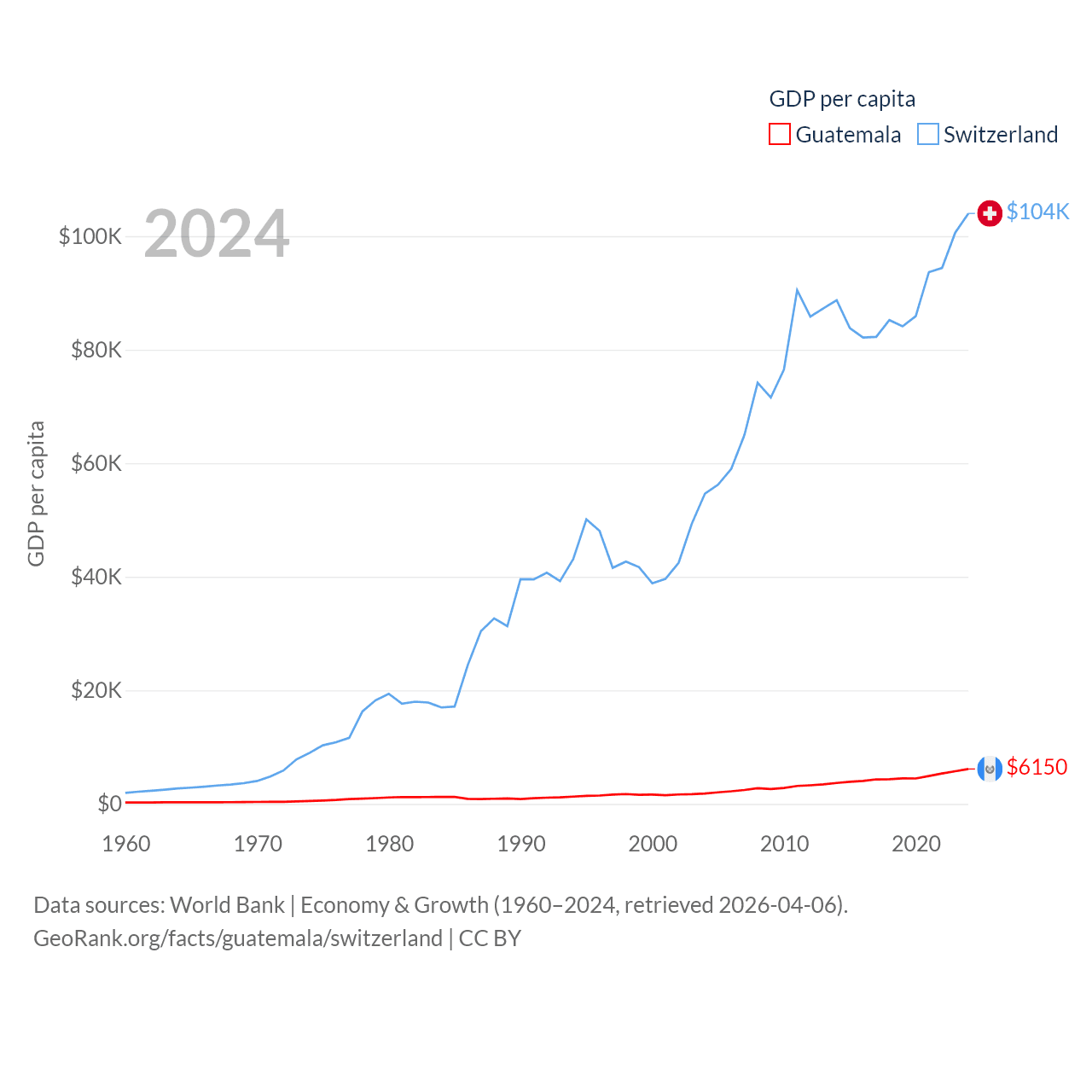By GDP, Guatemala ranks 68/197 ($113B) and Switzerland ranks 20/197 ($937B). By GDP per capita, Guatemala ranks 112/197 ($6,150), while Switzerland ranks 5/197 ($103,998).