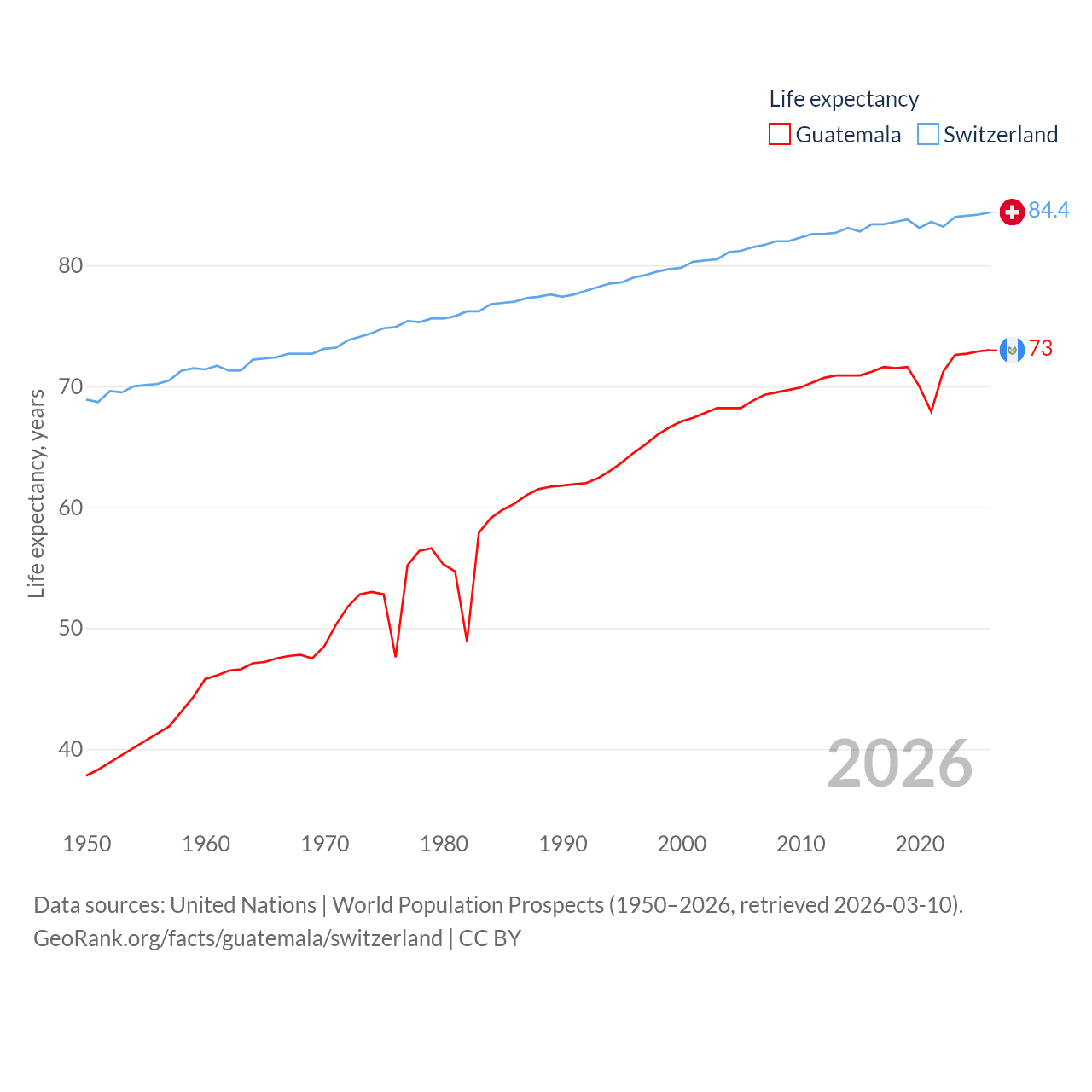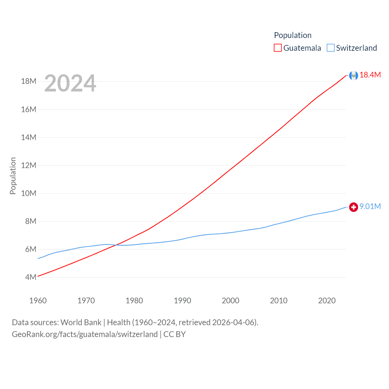 Guatemala has a population of 18.4M (ranked 70/197), compared with 9.01M in Switzerland (ranked 101/197). Guatemala's land area is 41,375 sq mi versus 15,255 sq mi for Switzerland (ranked 102nd vs. 131st).