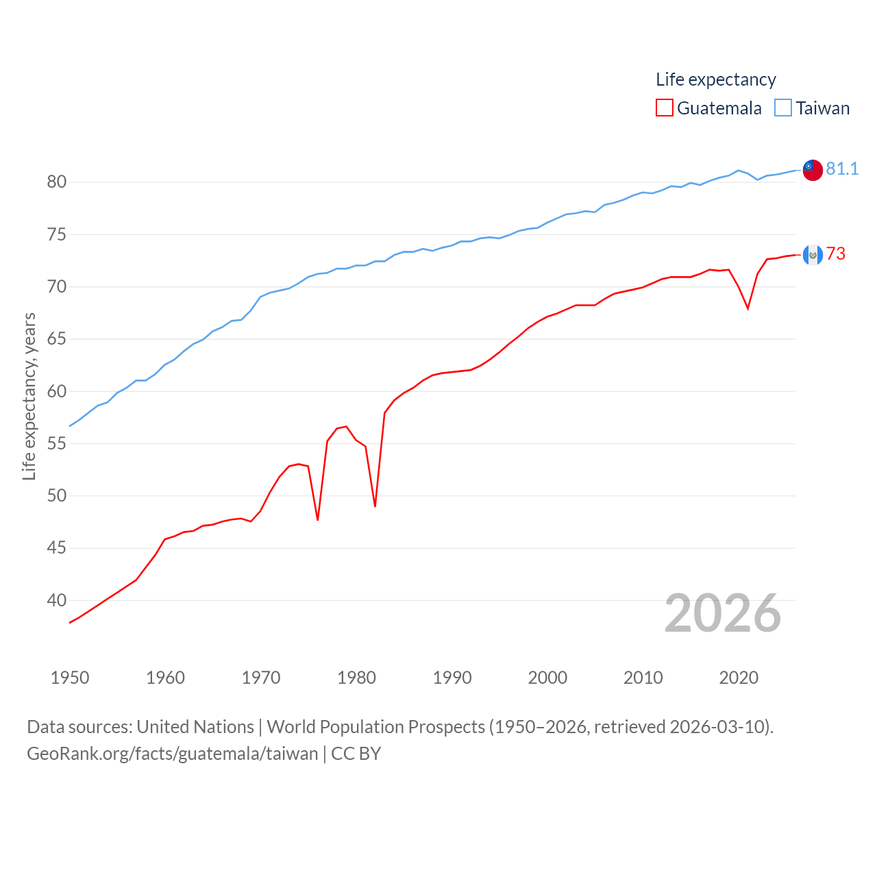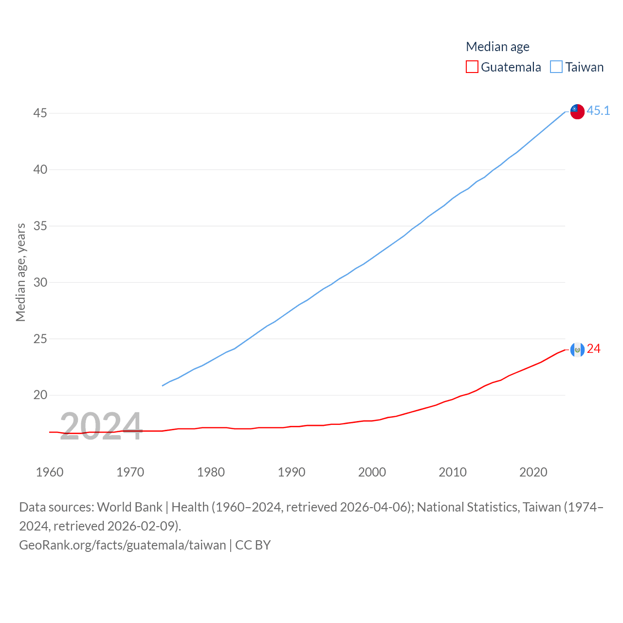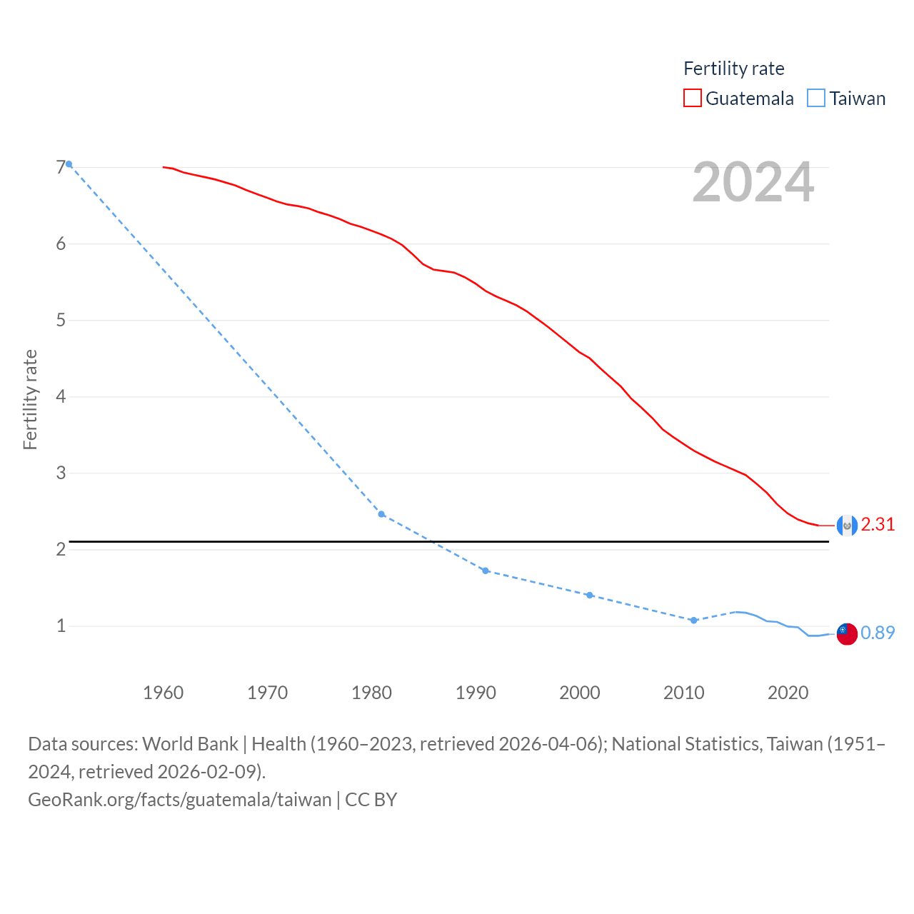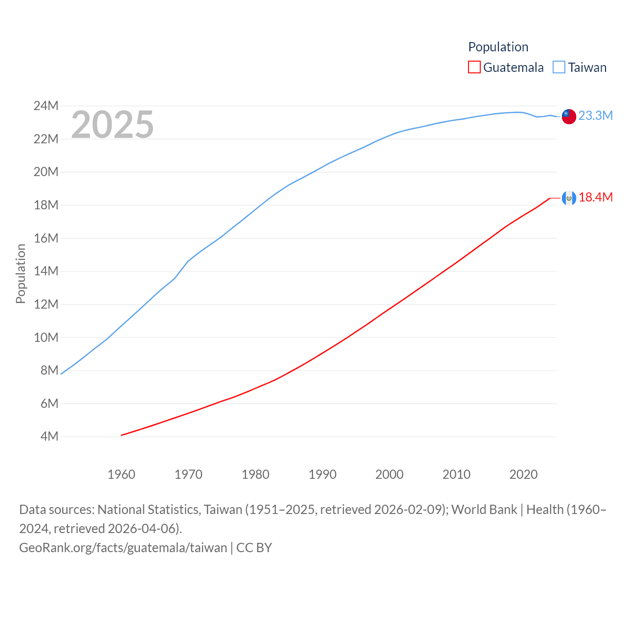 Guatemala has a population of 18.4M (ranked 70/197), compared with 23.3M in Taiwan (ranked 60/197). Guatemala's land area is 41,375 sq mi versus 13,976 sq mi for Taiwan (ranked 102nd vs. 133rd).