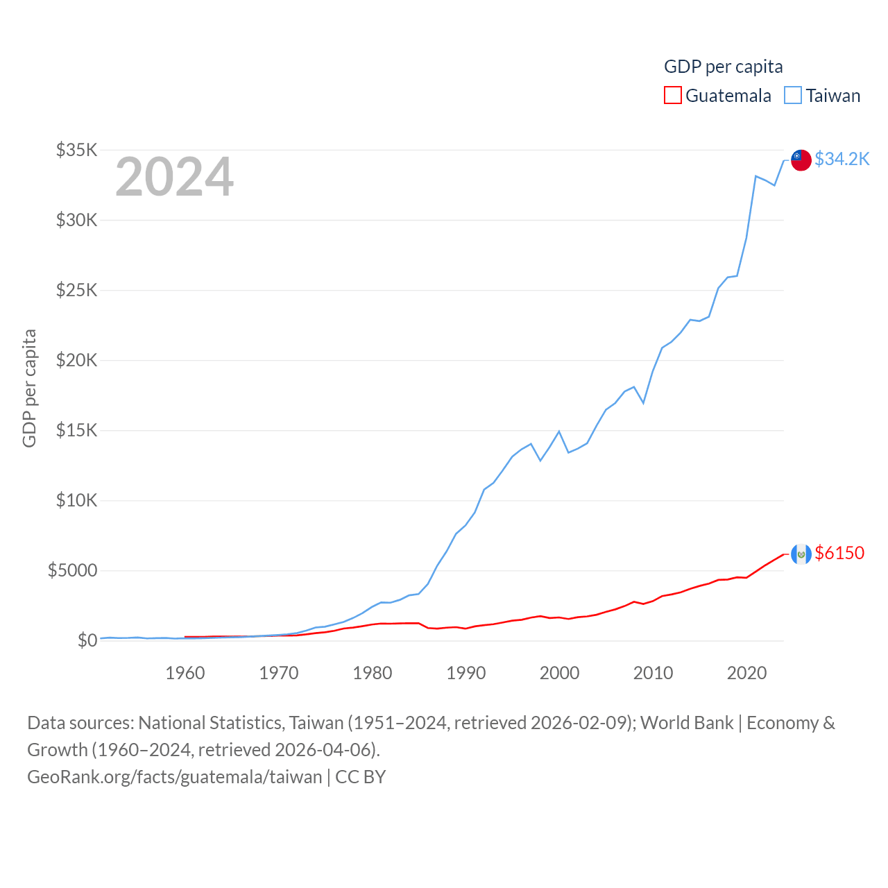 By GDP, Guatemala ranks 68/197 ($113B) and Taiwan ranks 22/197 ($802B). By GDP per capita, Guatemala ranks 112/197 ($6,150), while Taiwan ranks 35/197 ($34,238).