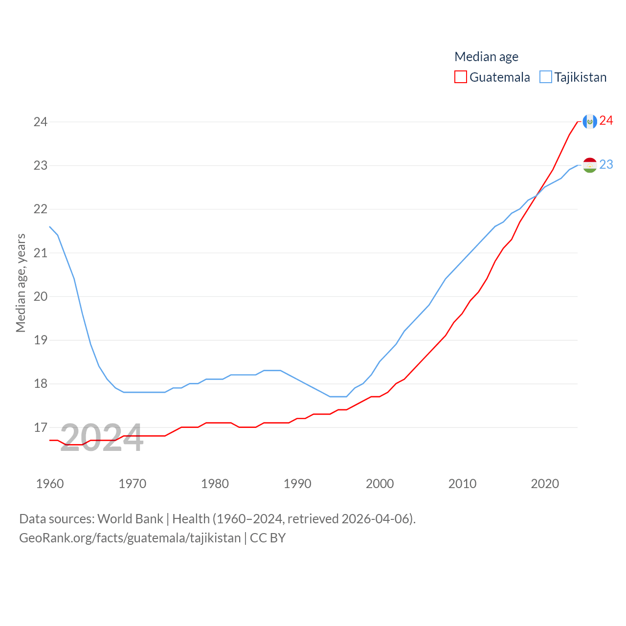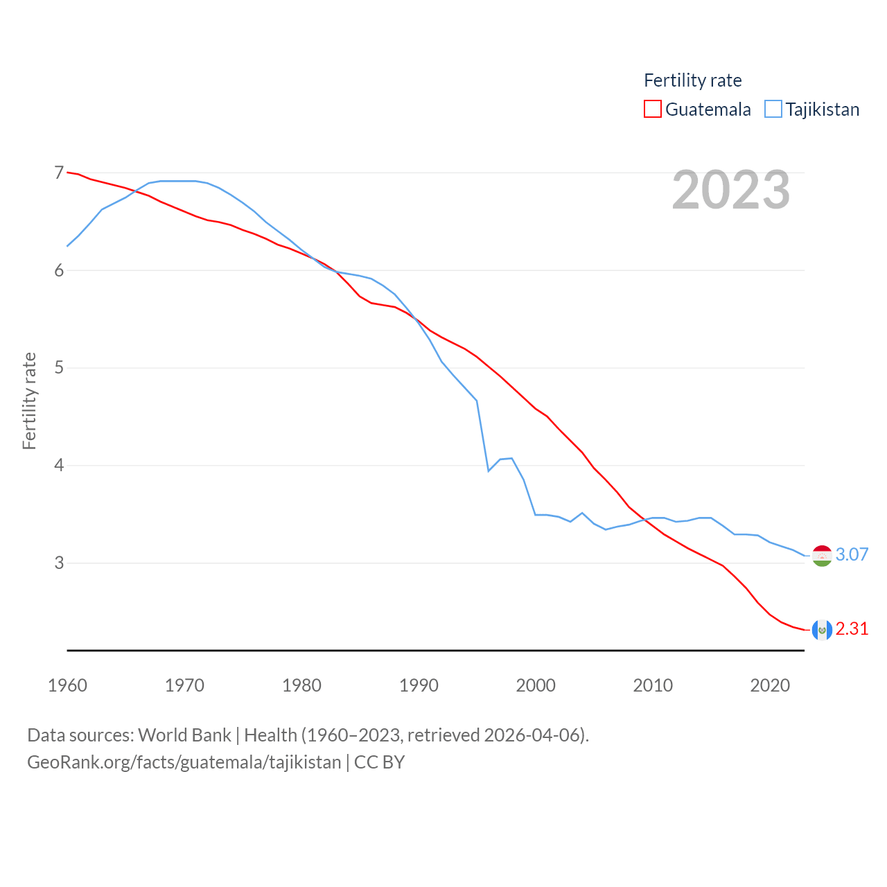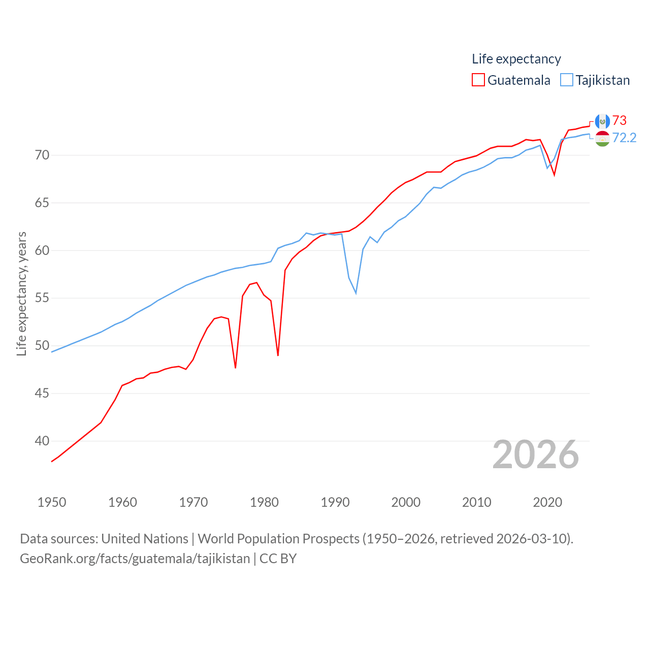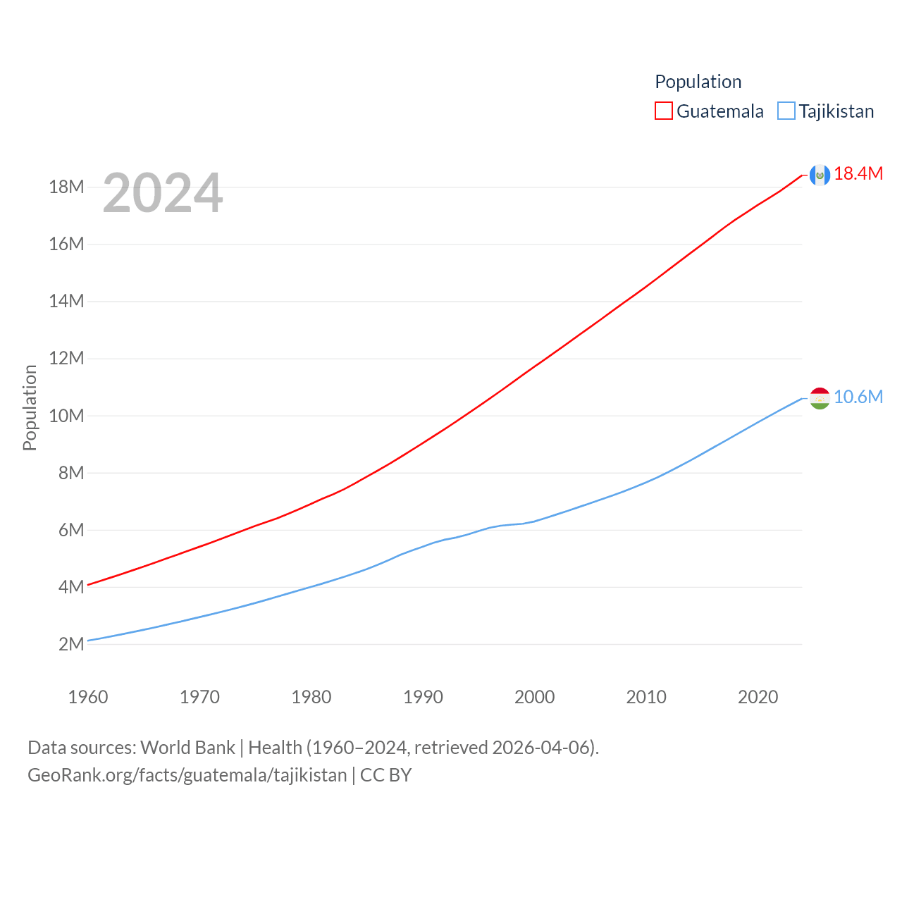 Guatemala has a population of 18.4M (ranked 70/197), compared with 10.6M in Tajikistan (ranked 91/197). Guatemala's land area is 41,375 sq mi versus 53,587 sq mi for Tajikistan (ranked 102nd vs. 93rd).