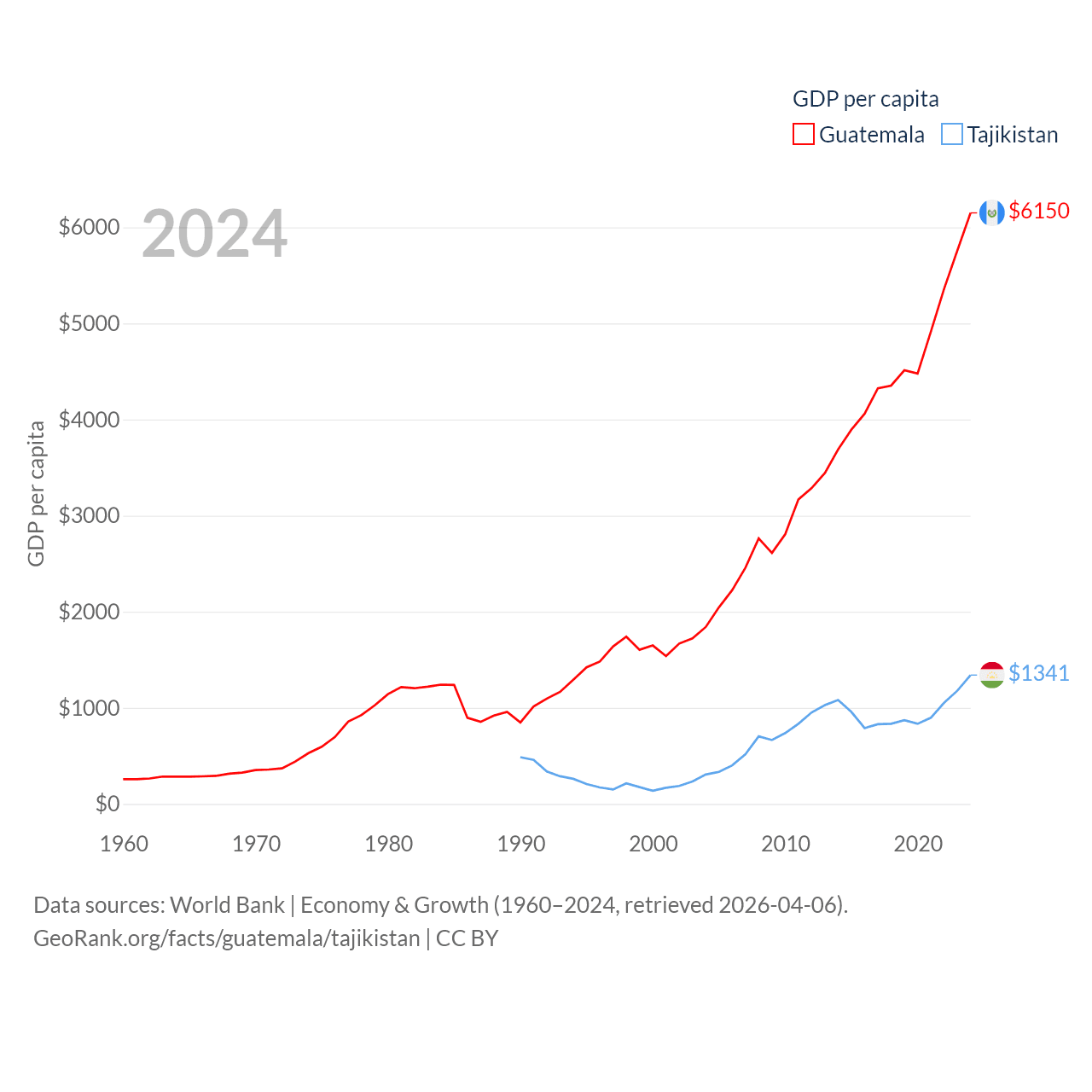 By GDP, Guatemala ranks 68/197 ($113B) and Tajikistan ranks 145/197 ($14.2B). By GDP per capita, Guatemala ranks 112/197 ($6,150), while Tajikistan ranks 166/197 ($1,341).