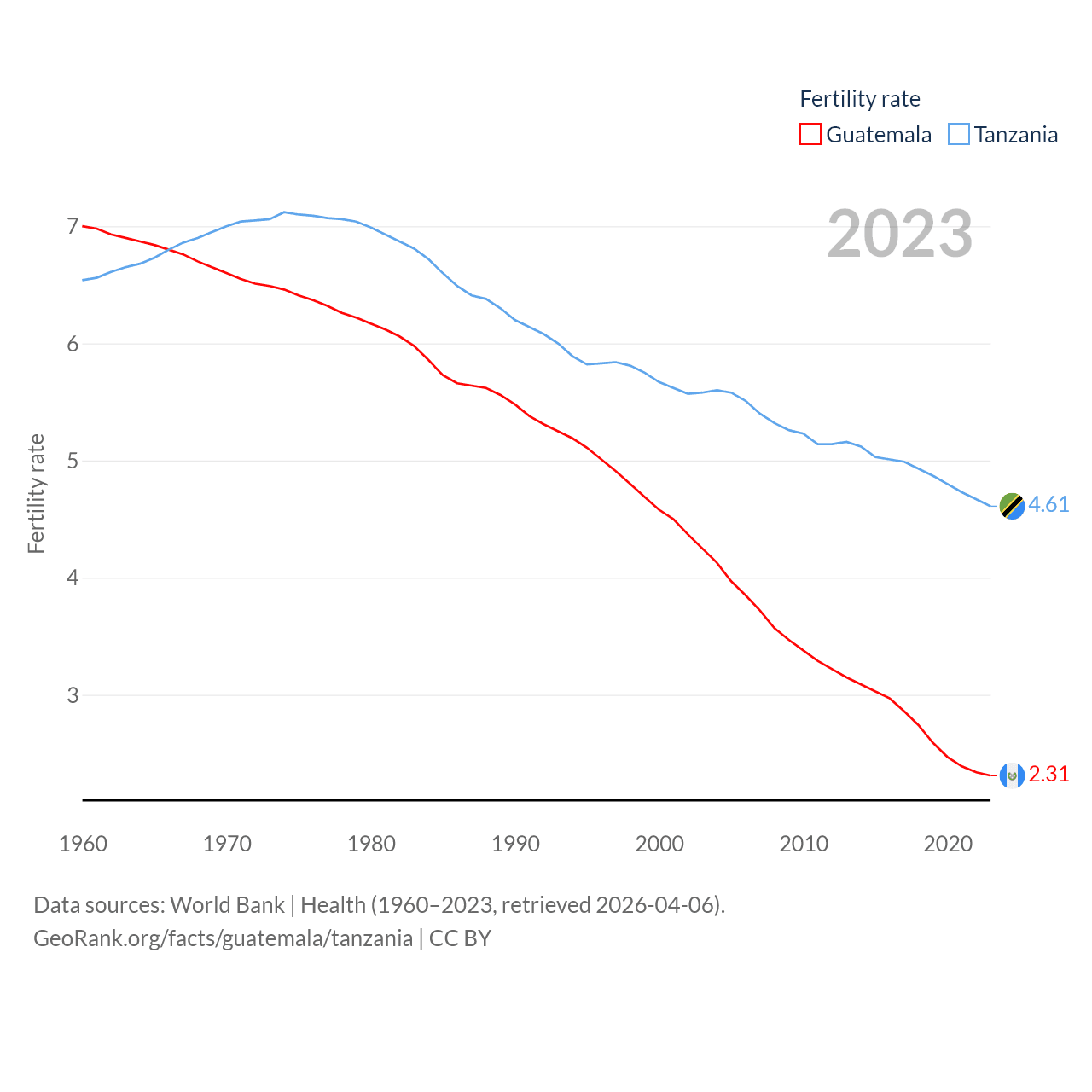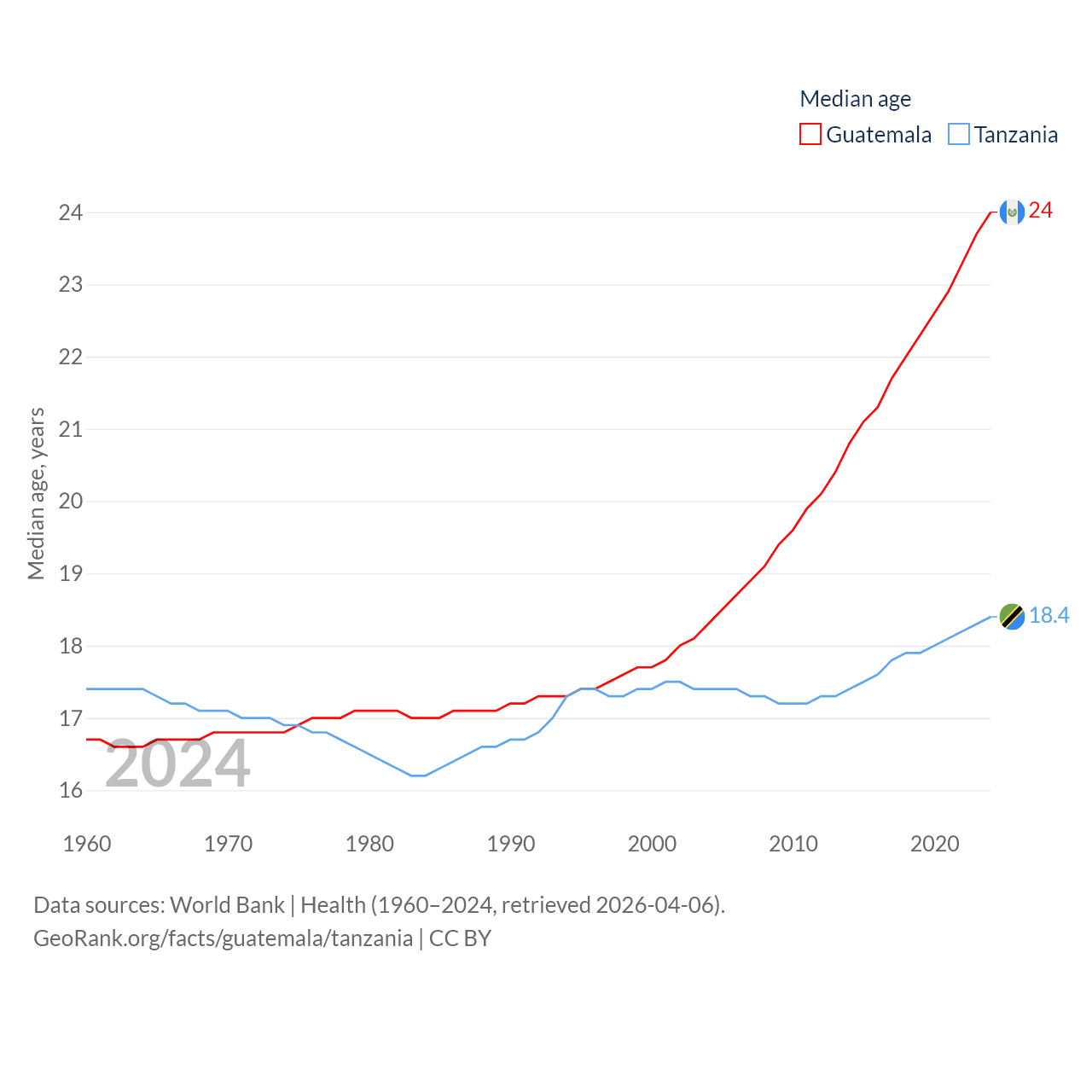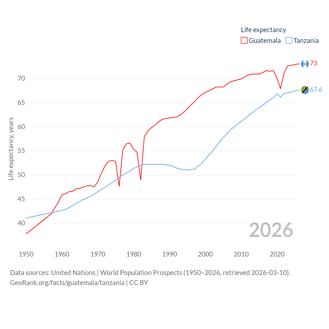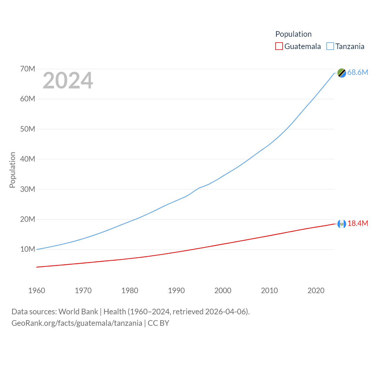 Guatemala has a population of 18.4M (ranked 70/197), compared with 68.6M in Tanzania (ranked 22/197). Guatemala's land area is 41,375 sq mi versus 342,009 sq mi for Tanzania (ranked 102nd vs. 31st).