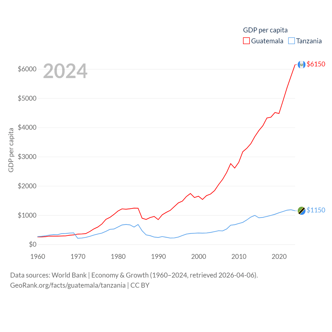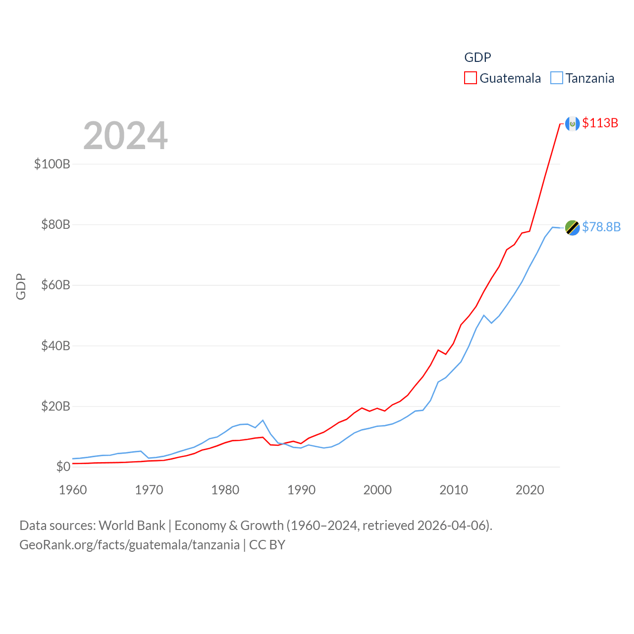 By GDP, Guatemala ranks 68/197 ($113B) and Tanzania ranks 82/197 ($78.8B). By GDP per capita, Guatemala ranks 112/197 ($6,150), while Tanzania ranks 170/197 ($1,150).