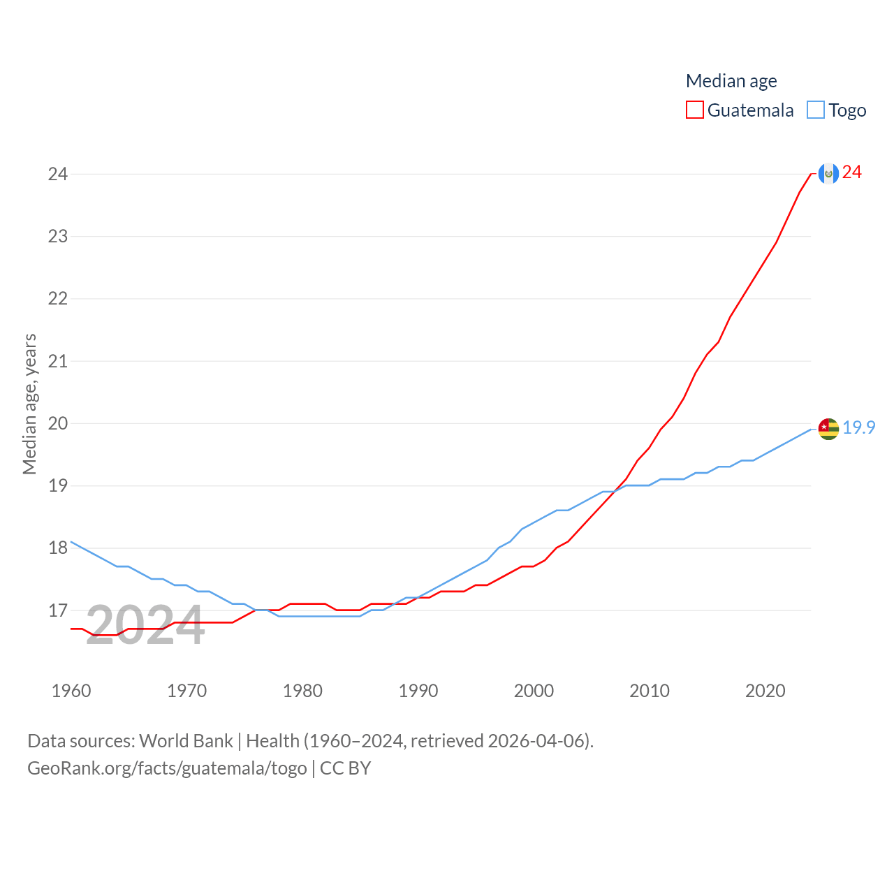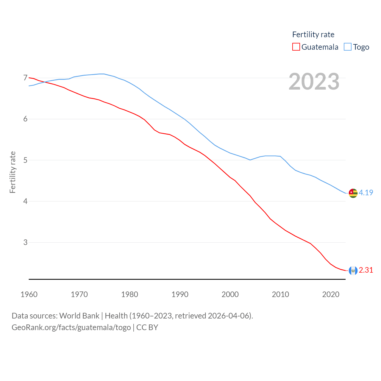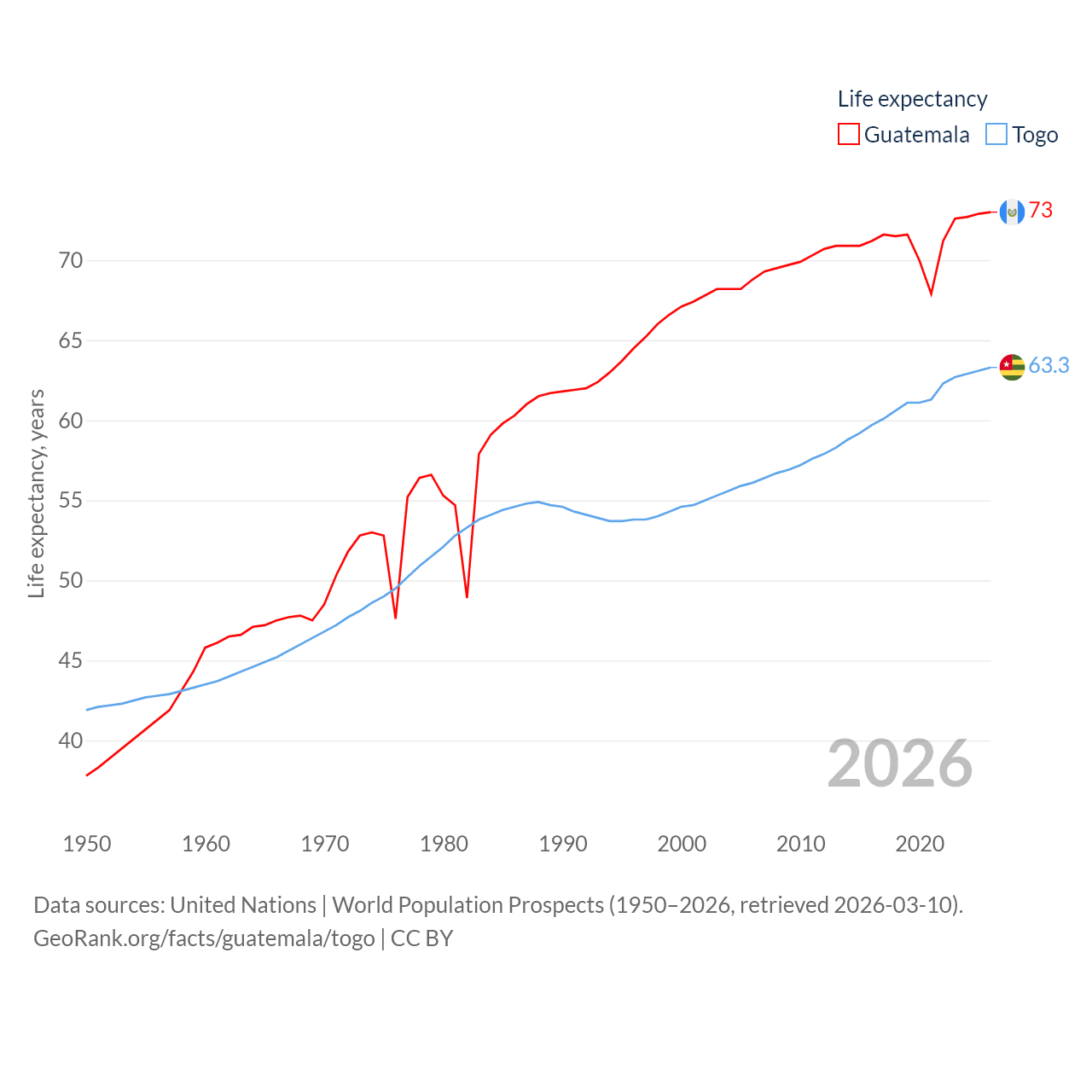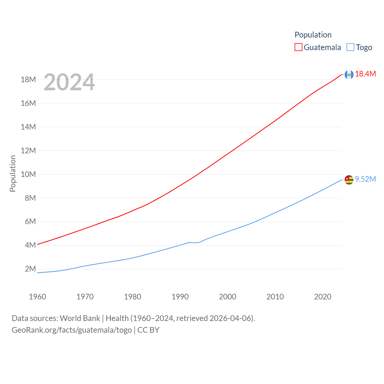 Guatemala has a population of 18.4M (ranked 70/197), compared with 9.52M in Togo (ranked 98/197). Guatemala's land area is 41,375 sq mi versus 21,000 sq mi for Togo (ranked 102nd vs. 124th).