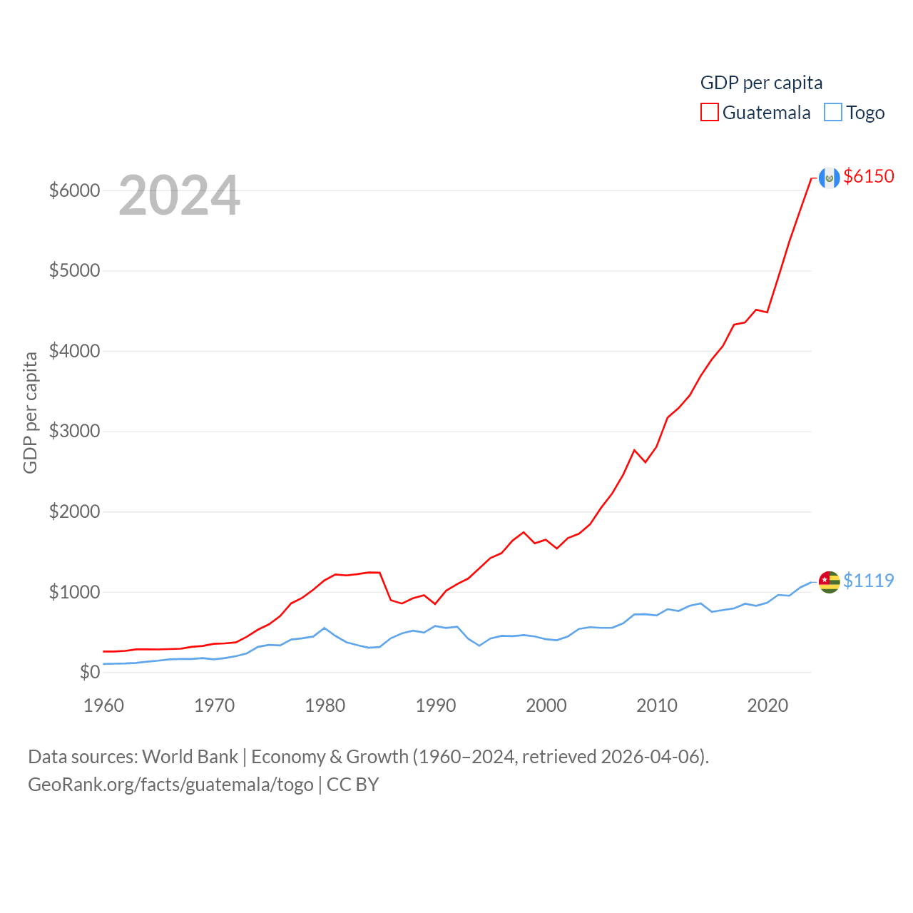 By GDP, Guatemala ranks 68/197 ($113B) and Togo ranks 154/197 ($10.7B). By GDP per capita, Guatemala ranks 112/197 ($6,150), while Togo ranks 172/197 ($1,119).