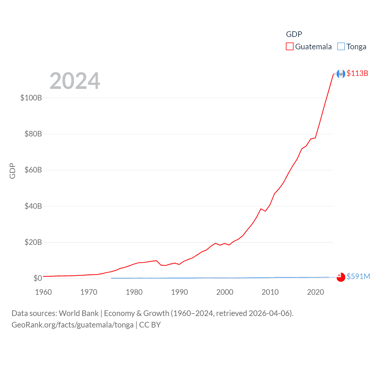 By GDP, Guatemala ranks 68/197 ($113B) and Tonga ranks 191/197 ($591M). By GDP per capita, Guatemala ranks 112/197 ($6,150), while Tonga ranks 115/197 ($5,652).
