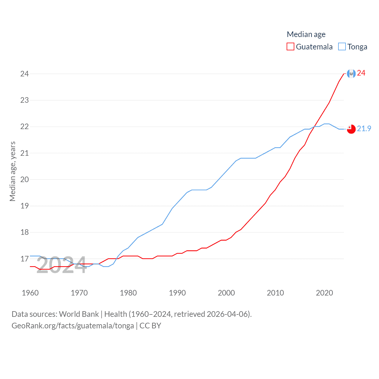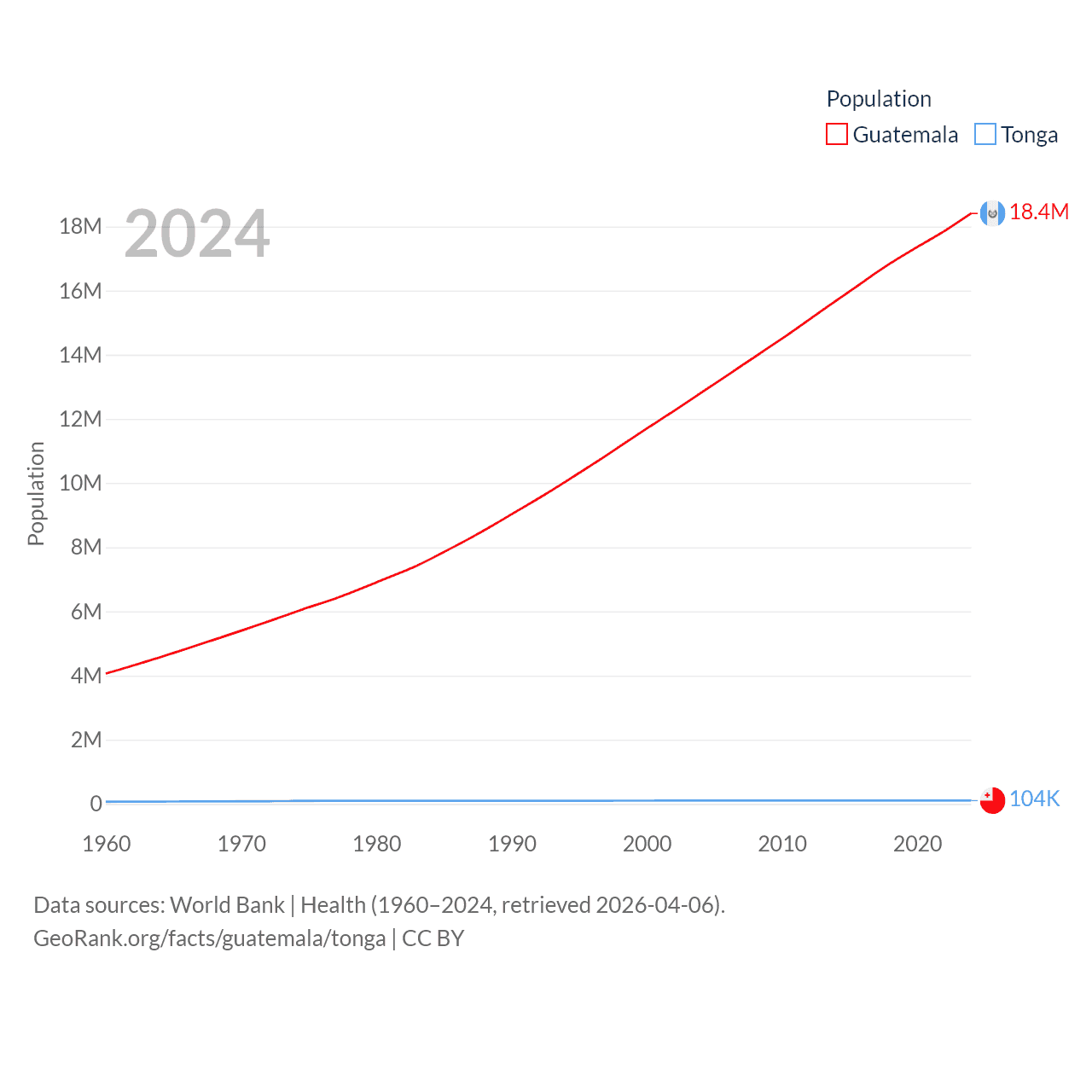 Guatemala has a population of 18.4M (ranked 70/197), compared with 104K in Tonga (ranked 183/197). Guatemala's land area is 41,375 sq mi versus 278 sq mi for Tonga (ranked 102nd vs. 176th).