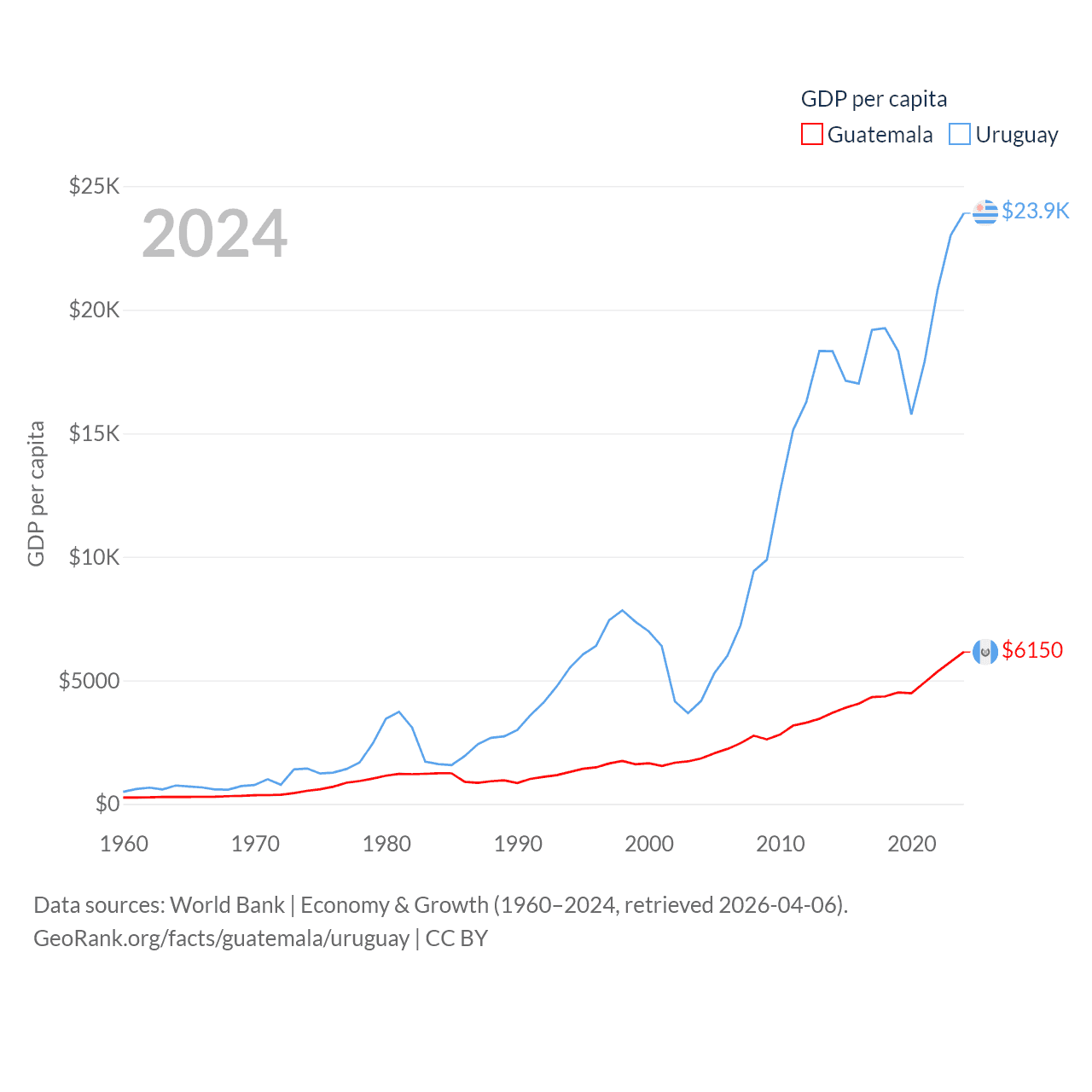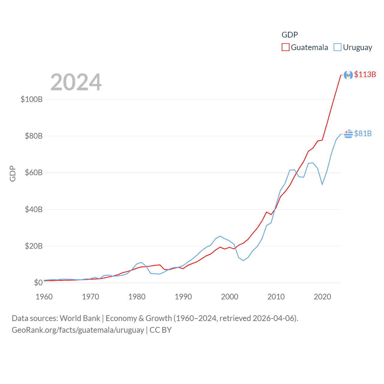 By GDP, Guatemala ranks 68/197 ($113B) and Uruguay ranks 81/197 ($81B). By GDP per capita, Guatemala ranks 112/197 ($6,150), while Uruguay ranks 52/197 ($23,907).