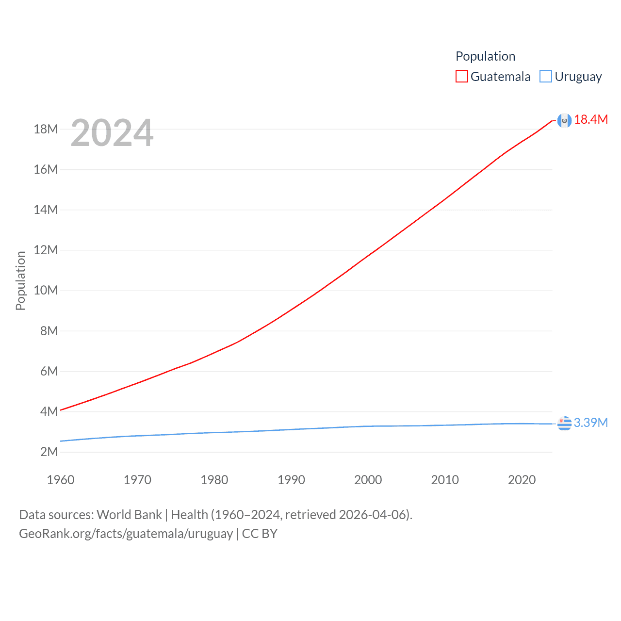 Guatemala has a population of 18.4M (ranked 70/197), compared with 3.39M in Uruguay (ranked 133/197). Guatemala's land area is 41,375 sq mi versus 67,576 sq mi for Uruguay (ranked 102nd vs. 89th).