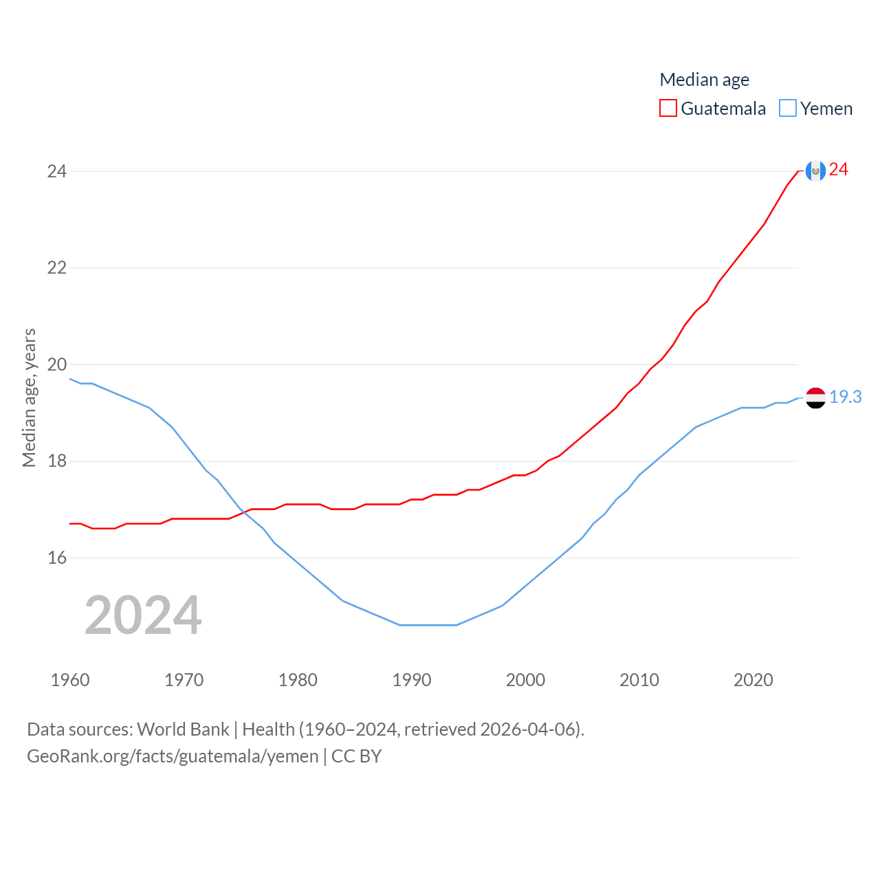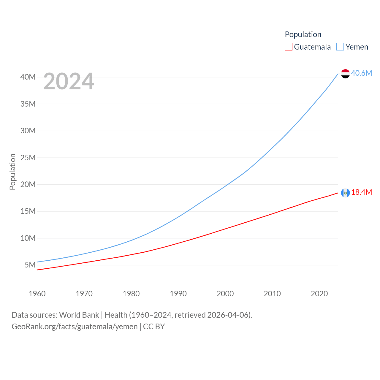 Guatemala has a population of 18.4M (ranked 70/197), compared with 40.6M in Yemen (ranked 38/197). Guatemala's land area is 41,375 sq mi versus 203,850 sq mi for Yemen (ranked 102nd vs. 49th).