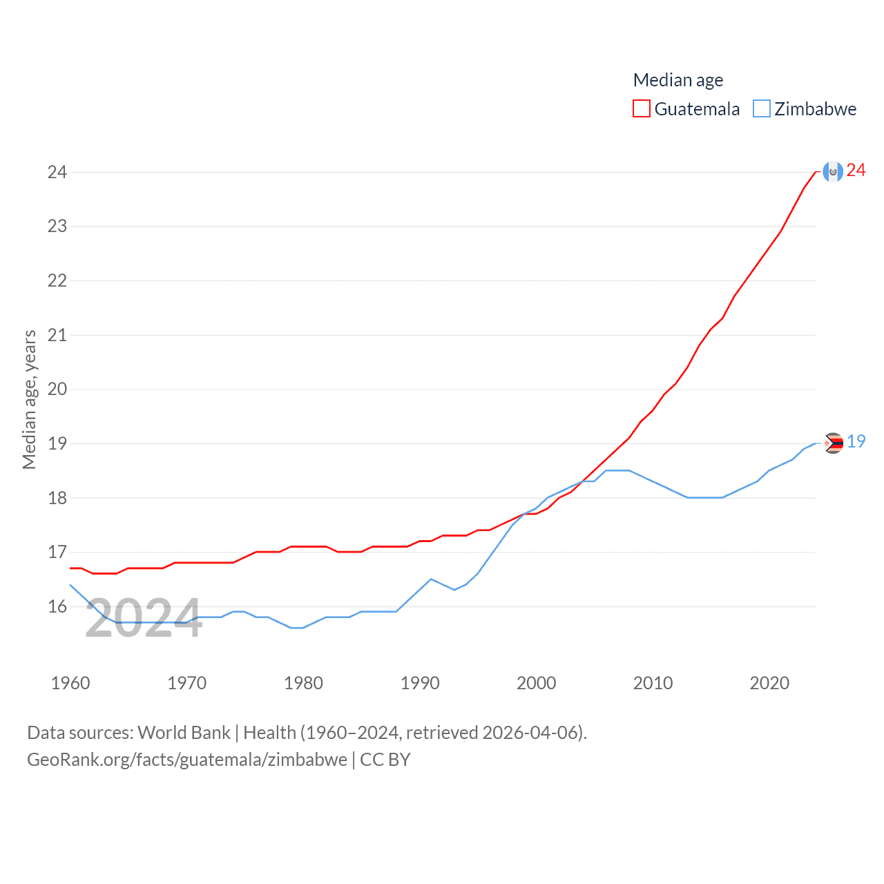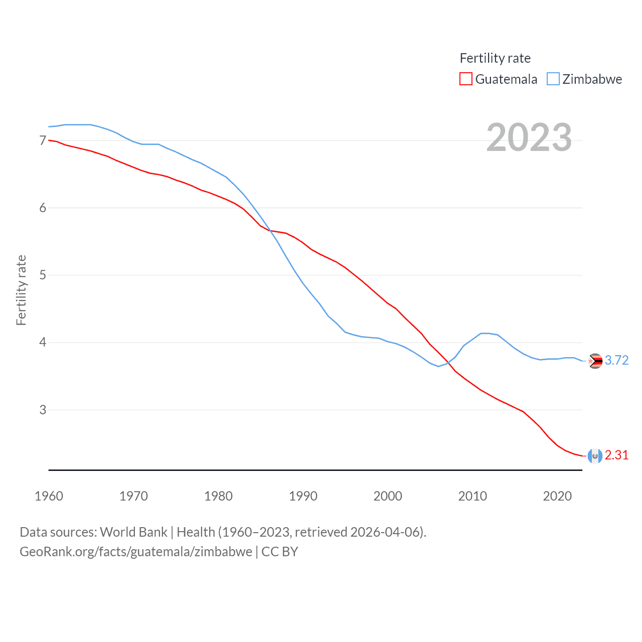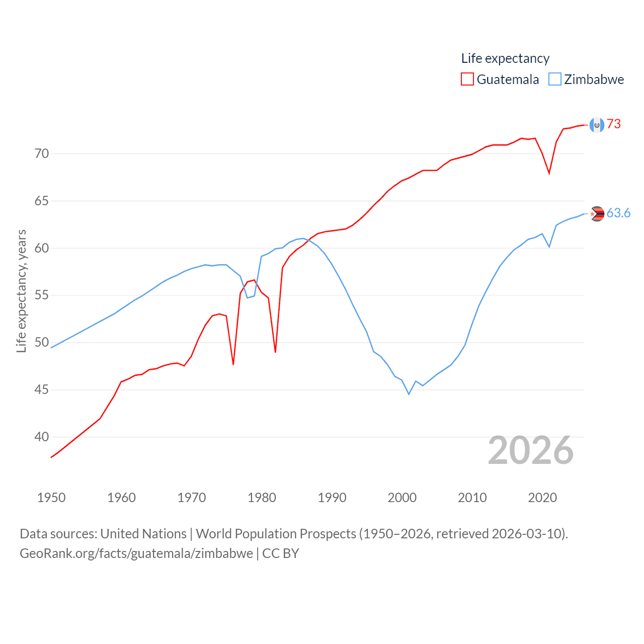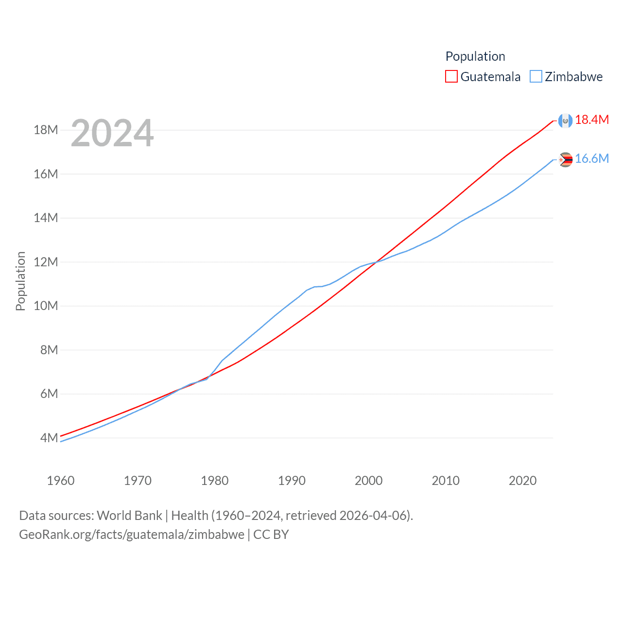 Guatemala has a population of 18.4M (ranked 70/197), compared with 16.6M in Zimbabwe (ranked 74/197). Guatemala's land area is 41,375 sq mi versus 149,364 sq mi for Zimbabwe (ranked 102nd vs. 60th).