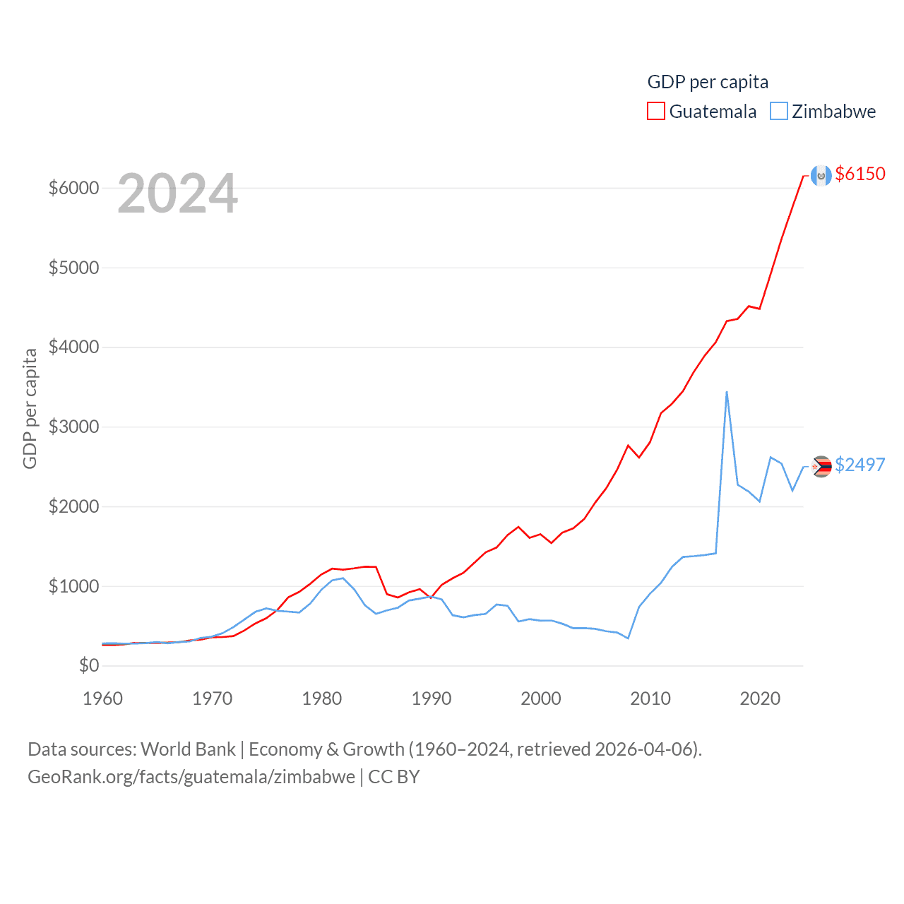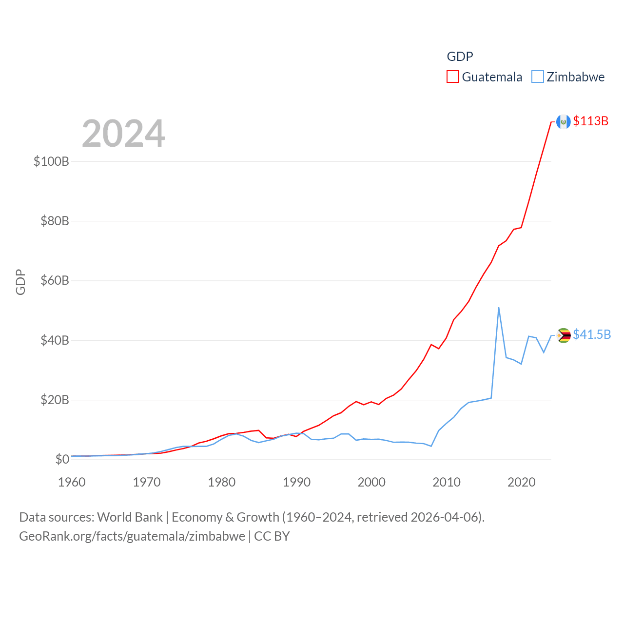 By GDP, Guatemala ranks 68/197 ($113B) and Zimbabwe ranks 102/197 ($41.5B). By GDP per capita, Guatemala ranks 112/197 ($6,150), while Zimbabwe ranks 148/197 ($2,497).