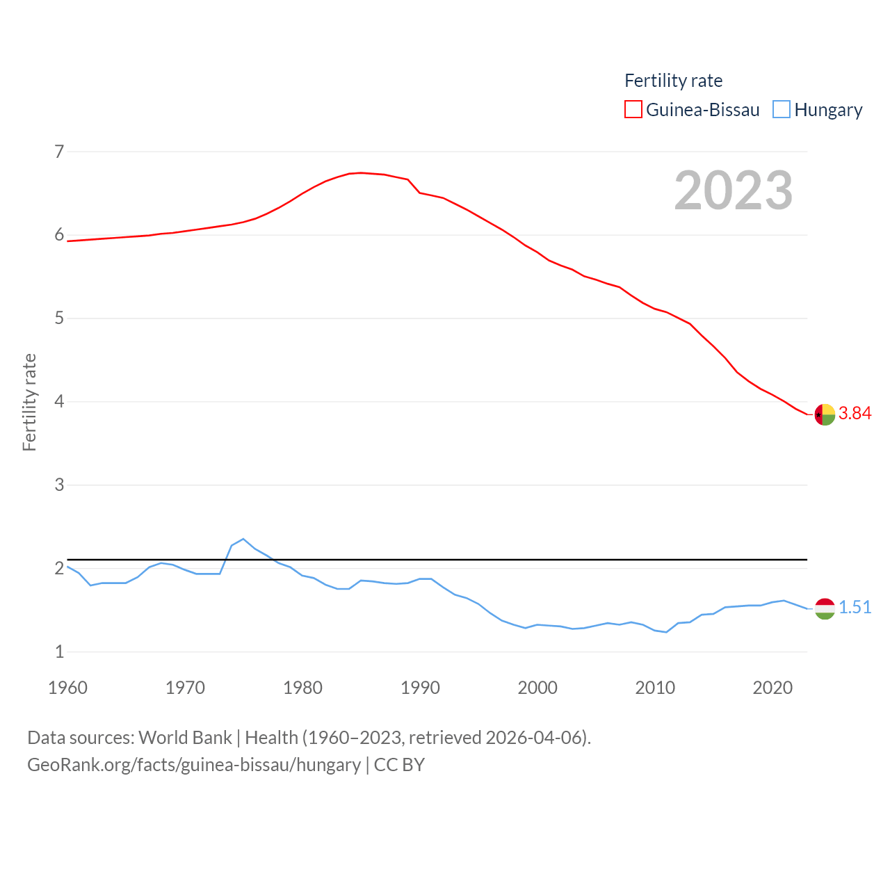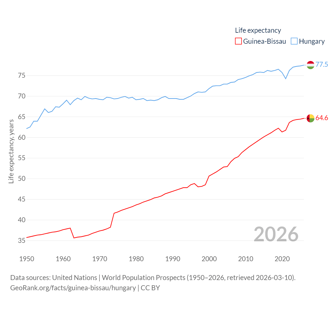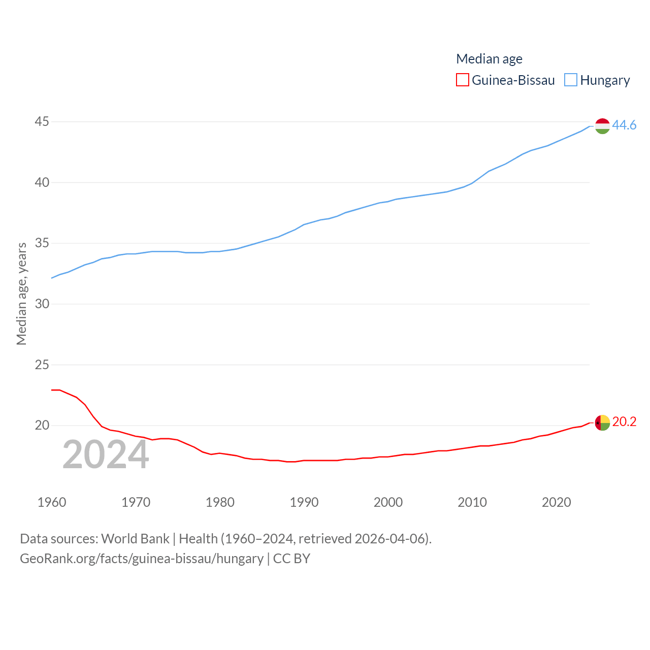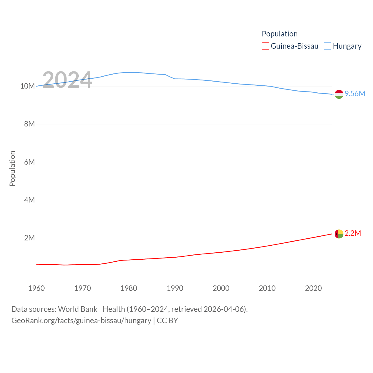 Guinea-Bissau has a population of 2.2M (ranked 146/197), compared with 9.56M in Hungary (ranked 97/197). Guinea-Bissau's land area is 10,857 sq mi versus 35,236 sq mi for Hungary (ranked 139th vs. 109th).