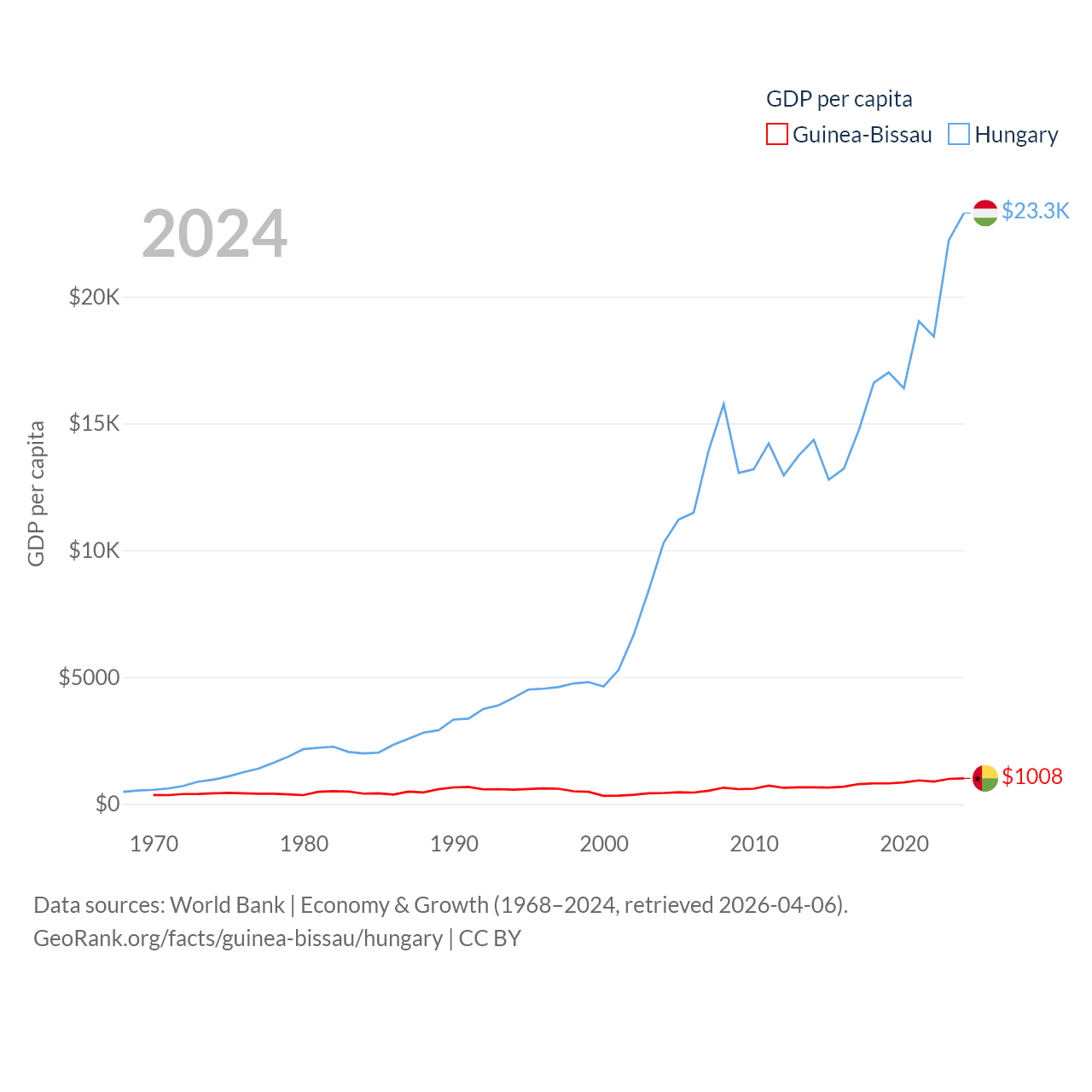 By GDP, Guinea-Bissau ranks 176/197 ($2.22B) and Hungary ranks 55/197 ($223B). By GDP per capita, Guinea-Bissau ranks 177/197 ($1,008), while Hungary ranks 55/197 ($23,292).