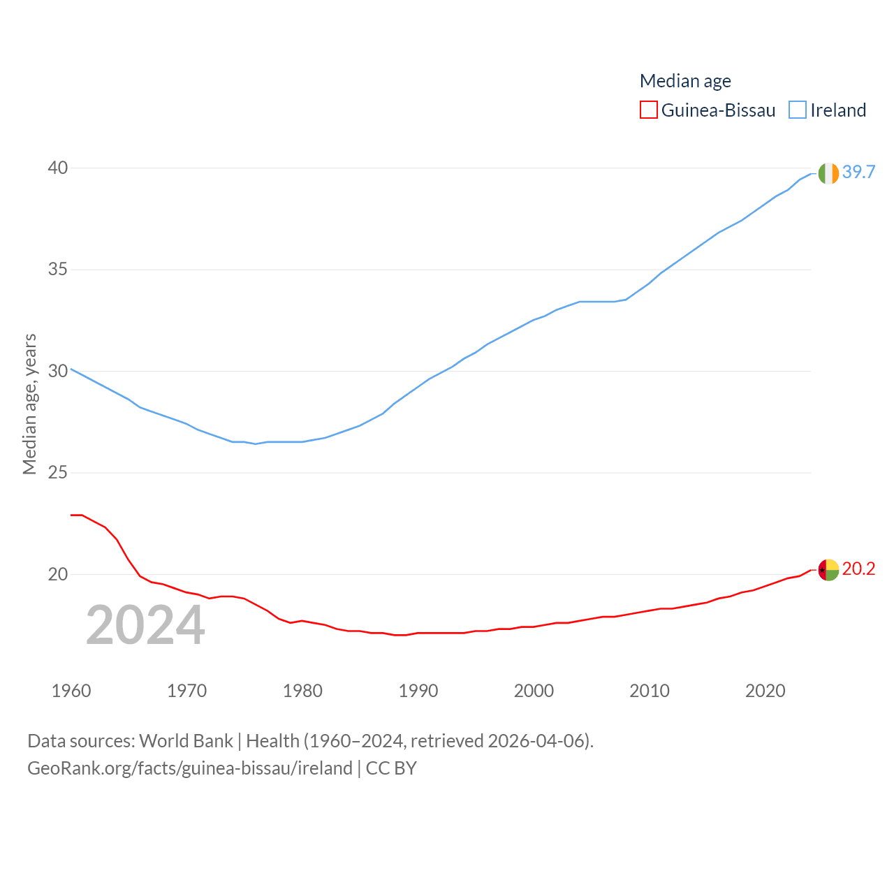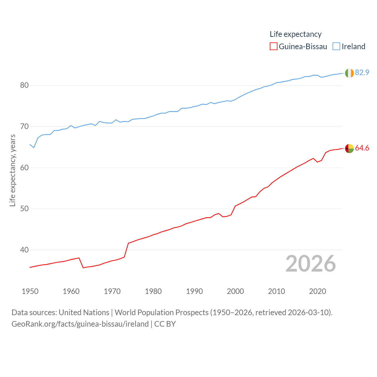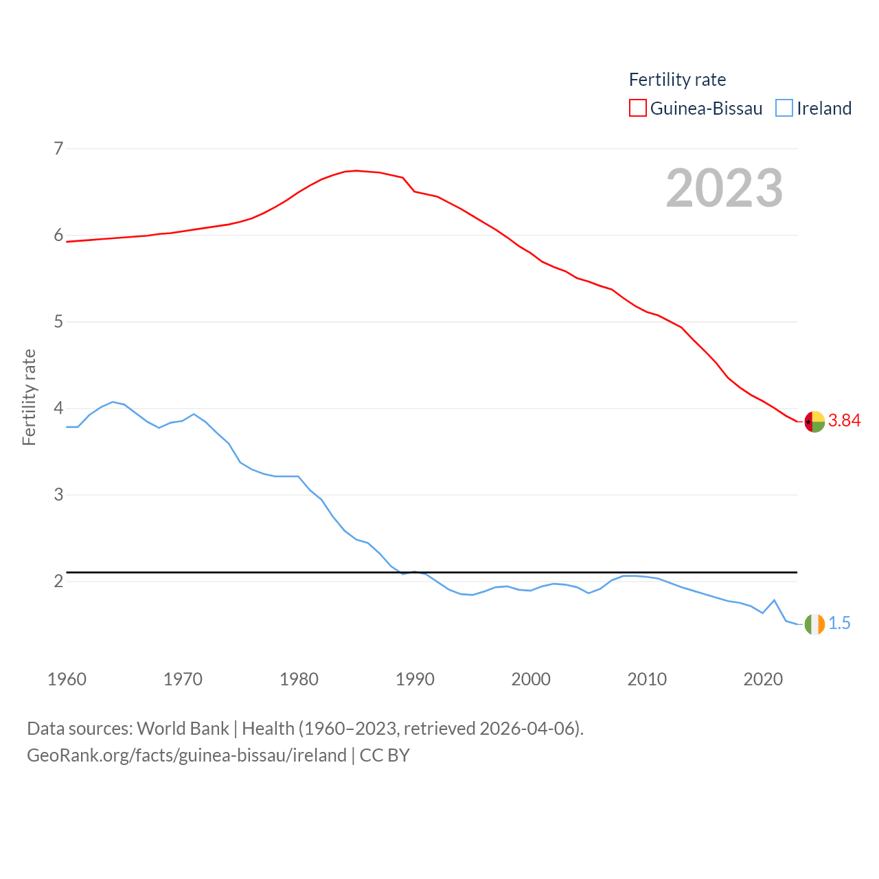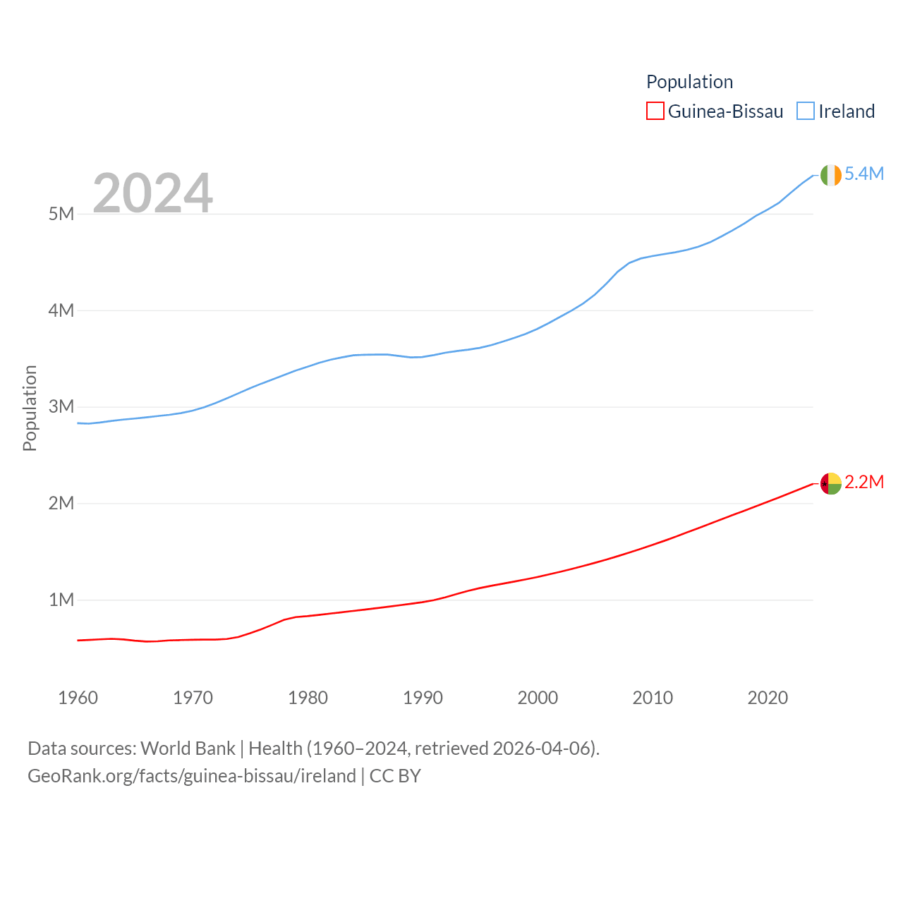 Guinea-Bissau has a population of 2.2M (ranked 146/197), compared with 5.4M in Ireland (ranked 120/197). Guinea-Bissau's land area is 10,857 sq mi versus 26,599 sq mi for Ireland (ranked 139th vs. 119th).