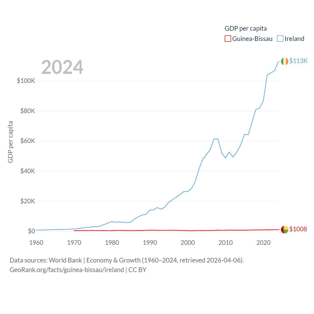 By GDP, Guinea-Bissau ranks 176/197 ($2.22B) and Ireland ranks 25/197 ($609B). By GDP per capita, Guinea-Bissau ranks 177/197 ($1,008), while Ireland ranks 4/197 ($112,895).