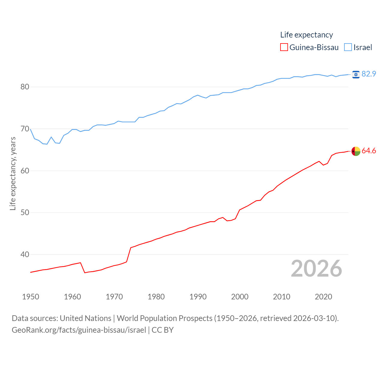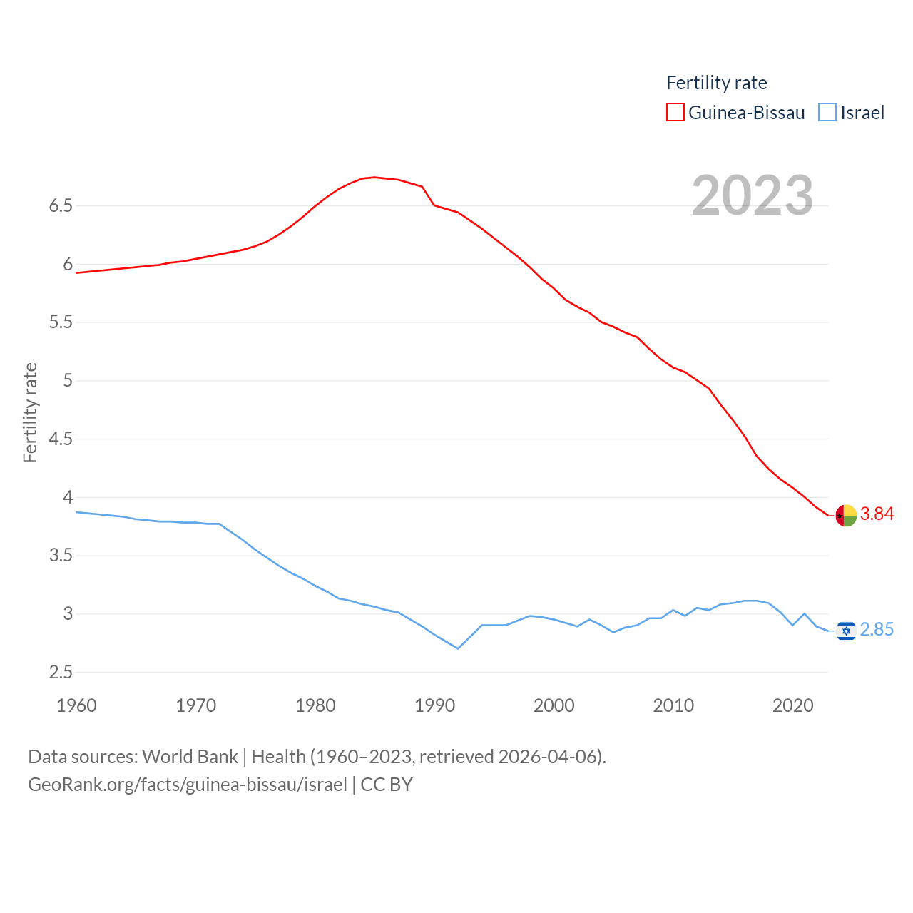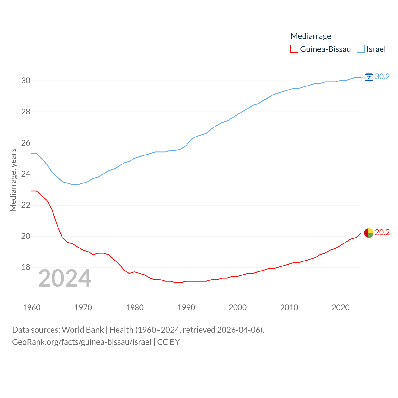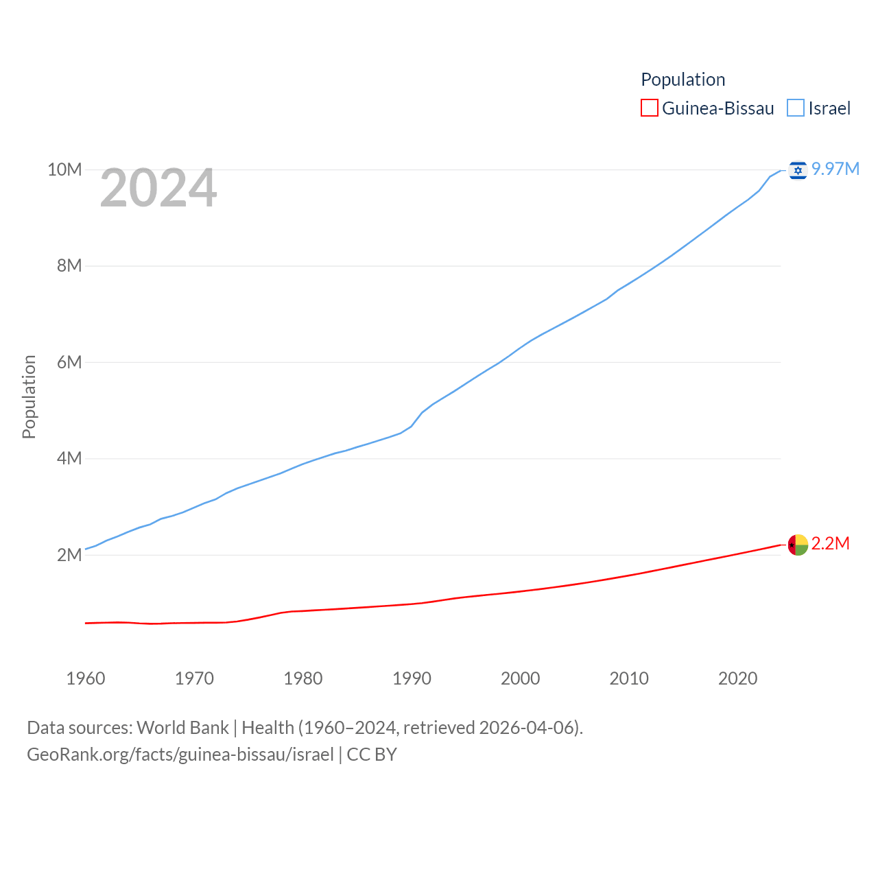 Guinea-Bissau has a population of 2.2M (ranked 146/197), compared with 9.97M in Israel (ranked 96/197). Guinea-Bissau's land area is 10,857 sq mi versus 8,355 sq mi for Israel (ranked 139th vs. 149th).