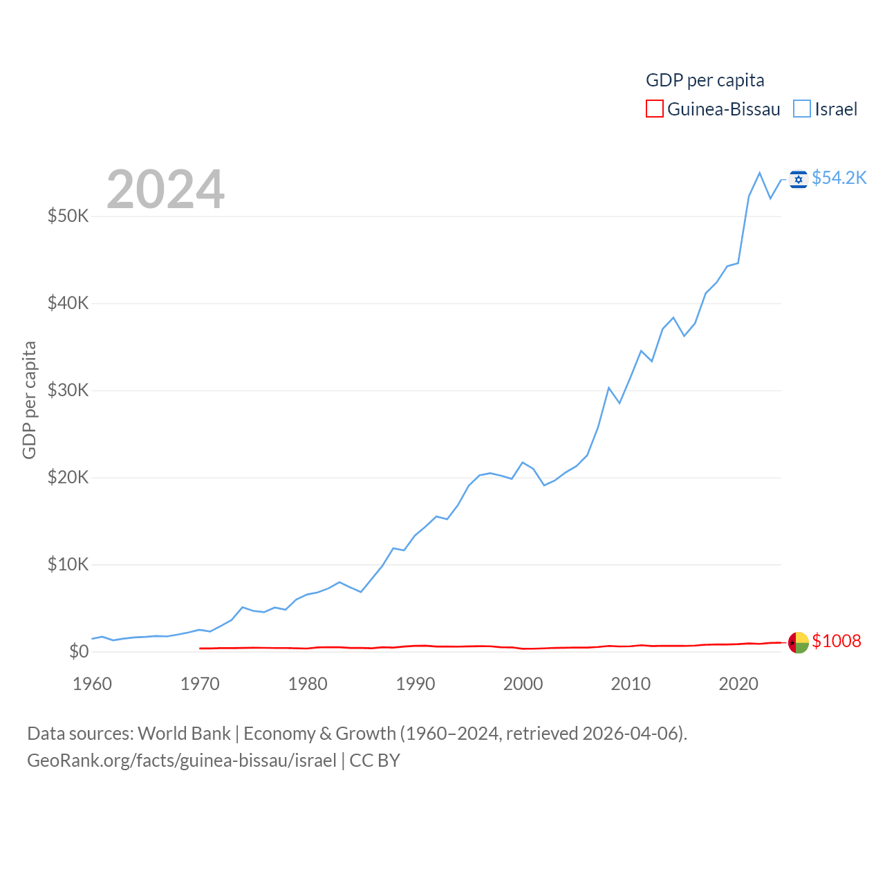 By GDP, Guinea-Bissau ranks 176/197 ($2.22B) and Israel ranks 29/197 ($540B). By GDP per capita, Guinea-Bissau ranks 177/197 ($1,008), while Israel ranks 21/197 ($54,177).