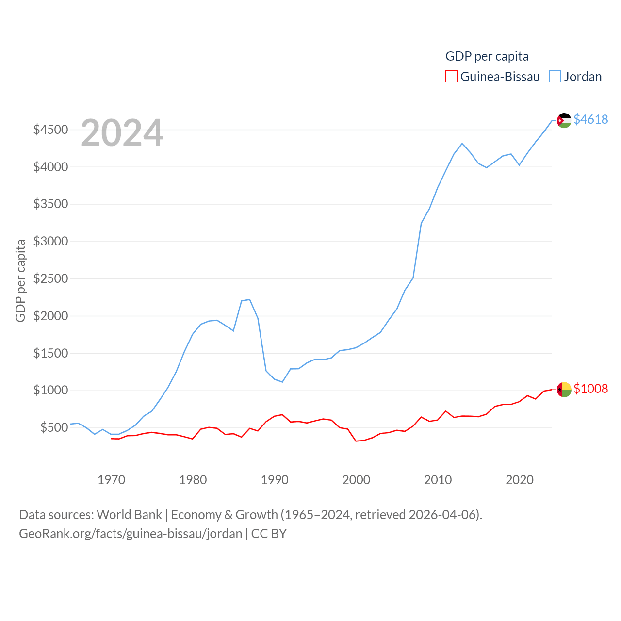 By GDP, Guinea-Bissau ranks 176/197 ($2.22B) and Jordan ranks 90/197 ($53.4B). By GDP per capita, Guinea-Bissau ranks 177/197 ($1,008), while Jordan ranks 123/197 ($4,618).