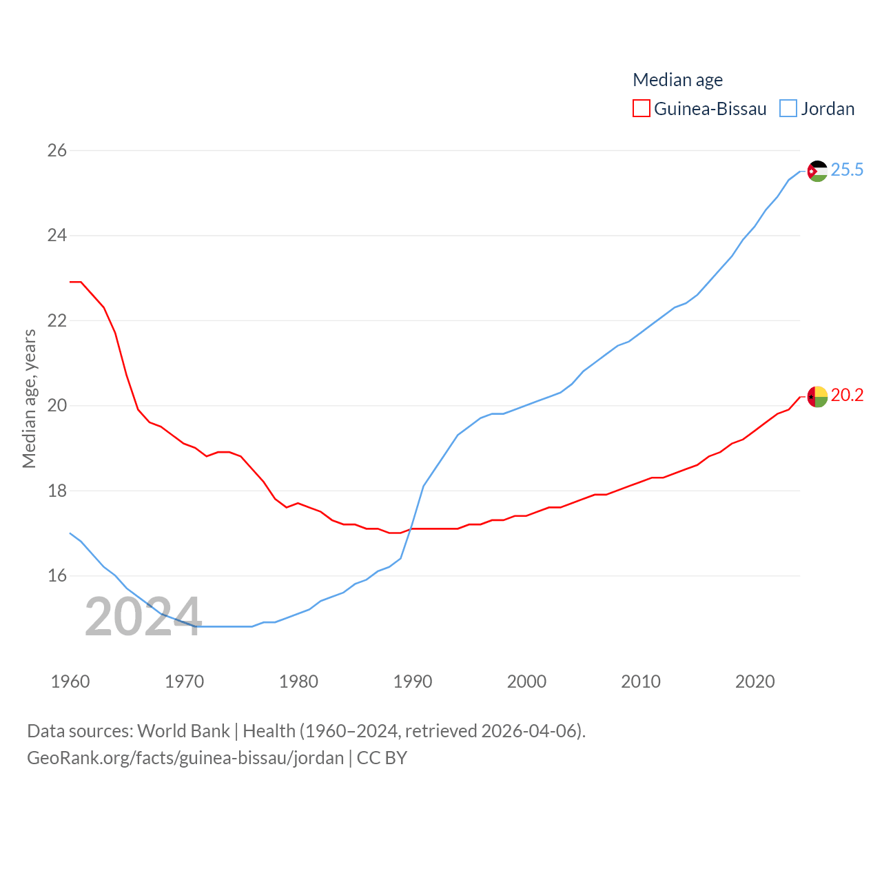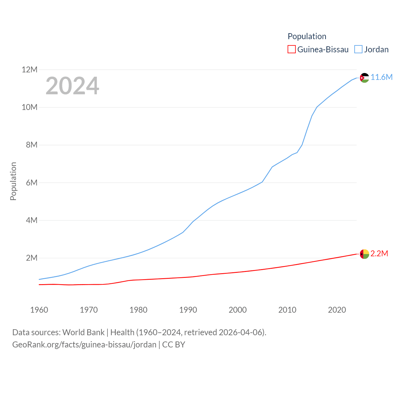 Guinea-Bissau has a population of 2.2M (ranked 146/197), compared with 11.6M in Jordan (ranked 84/197). Guinea-Bissau's land area is 10,857 sq mi versus 34,284 sq mi for Jordan (ranked 139th vs. 110th).