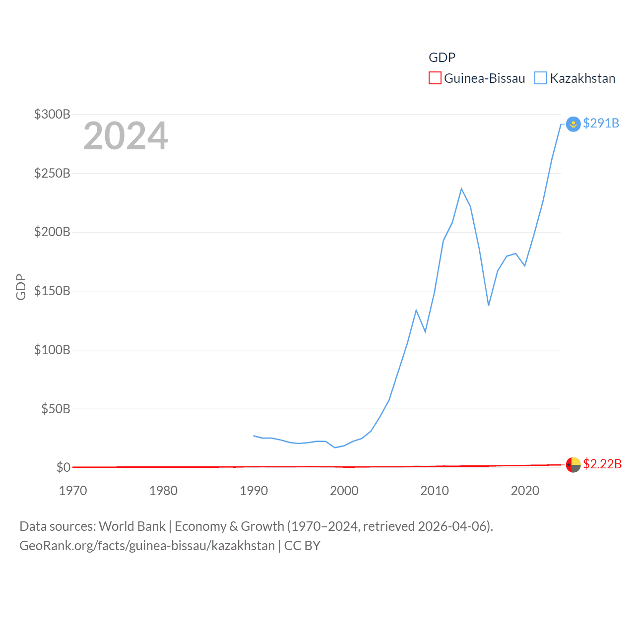 By GDP, Guinea-Bissau ranks 176/197 ($2.22B) and Kazakhstan ranks 48/197 ($291B). By GDP per capita, Guinea-Bissau ranks 177/197 ($1,008), while Kazakhstan ranks 71/197 ($14,155).